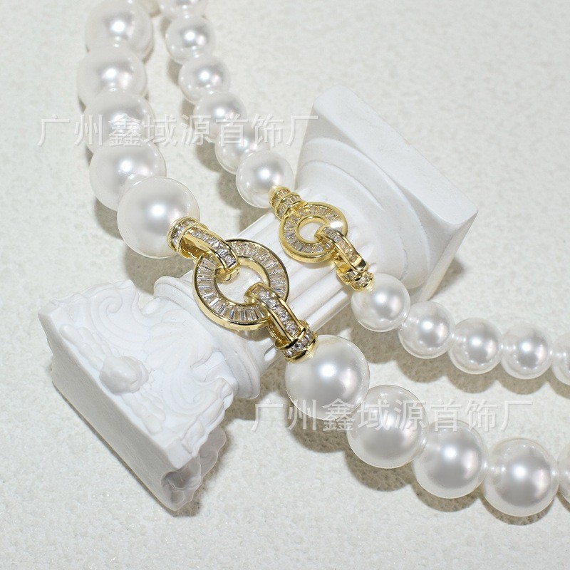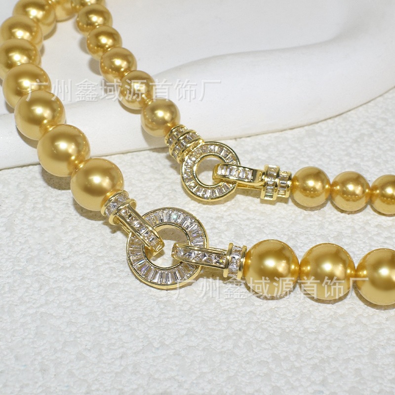 Color: White pearl gold disc t square buckle necklace