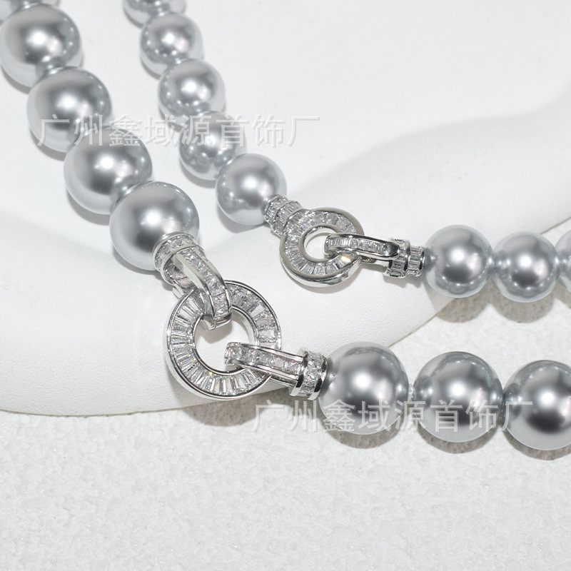 Color: Gray bead silver disc t square buckle necklace