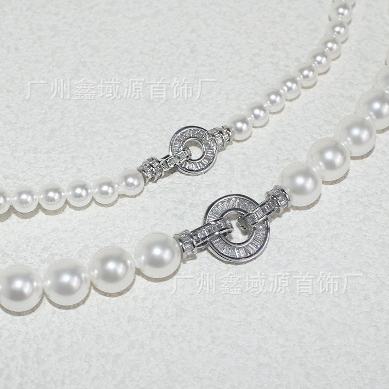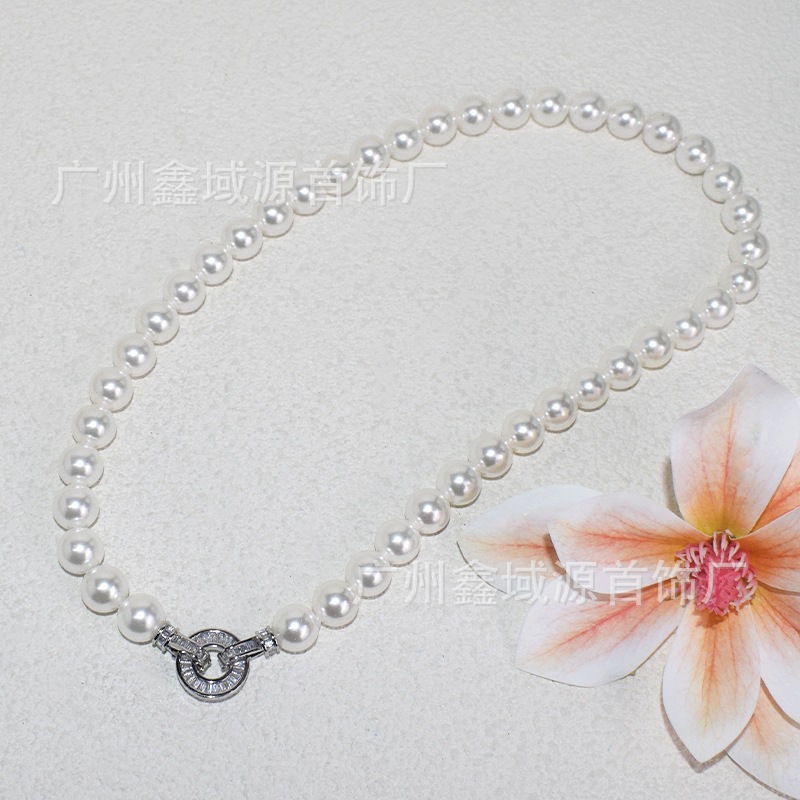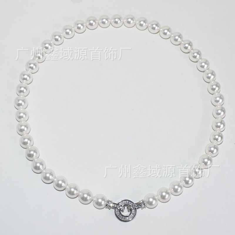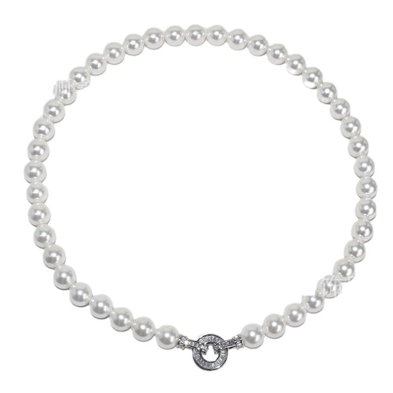 Color: White pearl silver disc t square buckle necklace