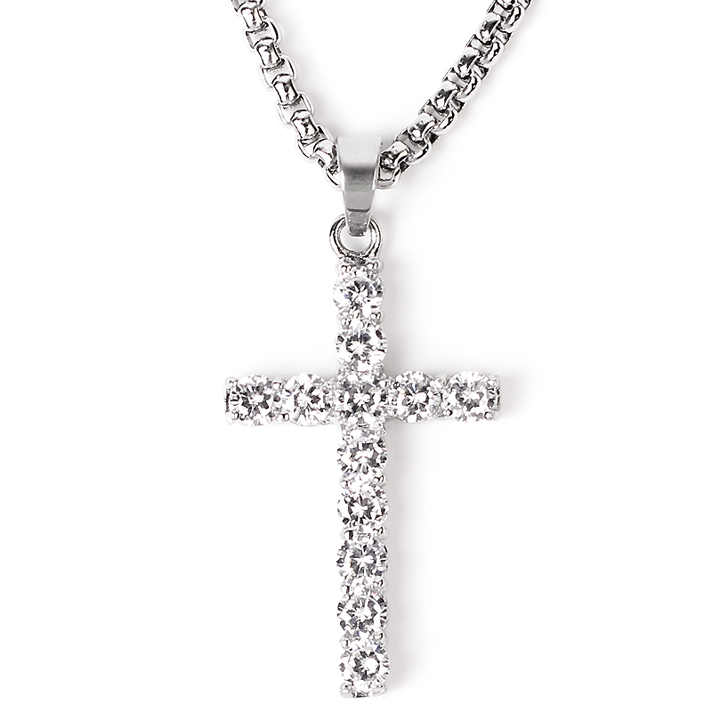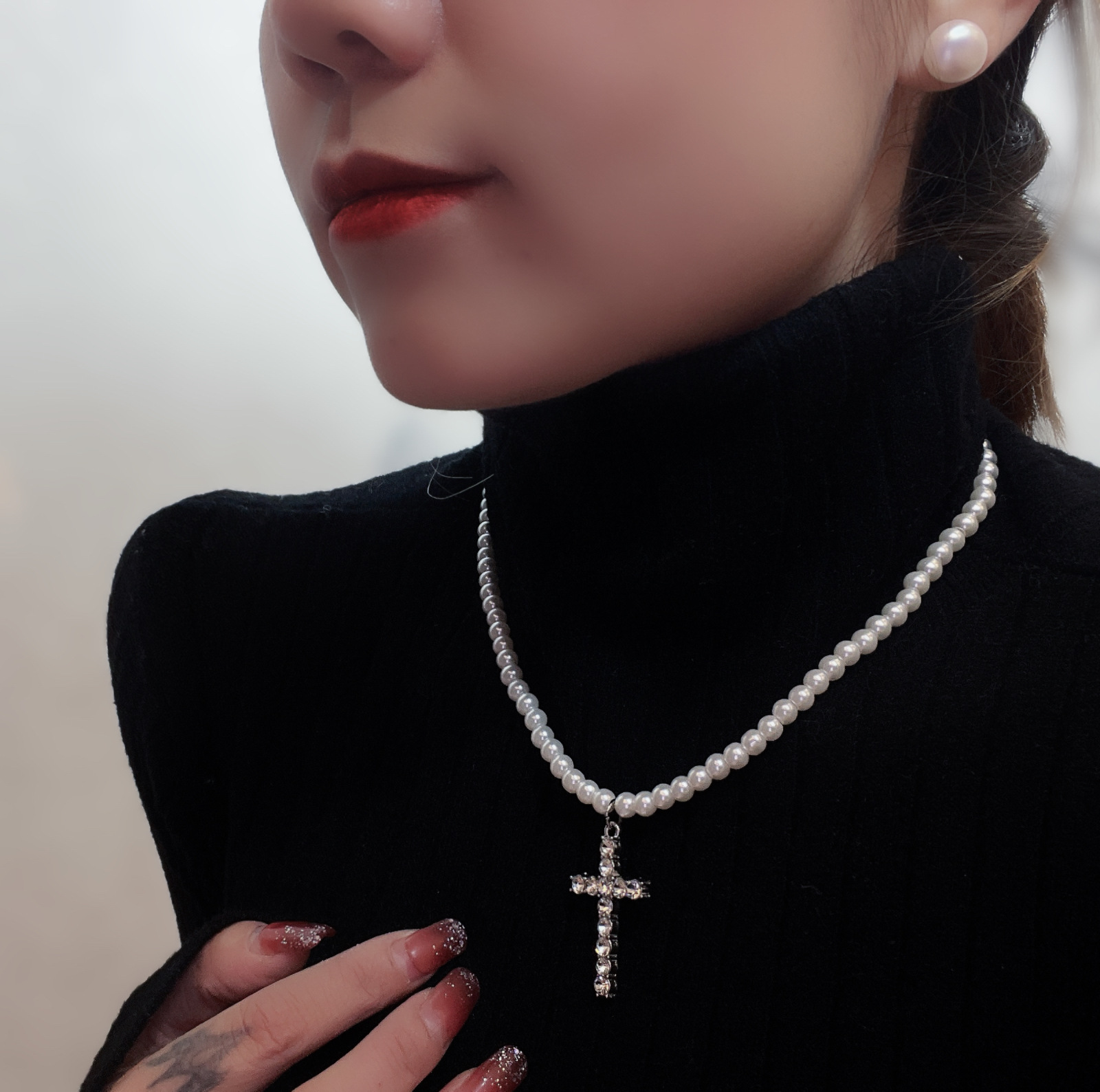 Full diamond cross necklace men's and women's clavicle chain ins glass Pearl titanium steel chain high street rap Street sweater chain