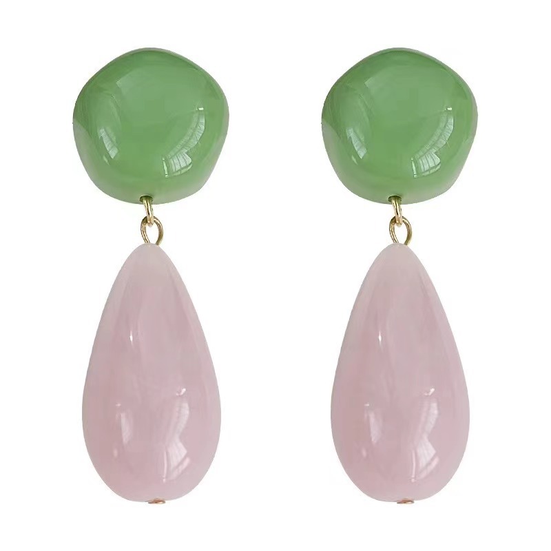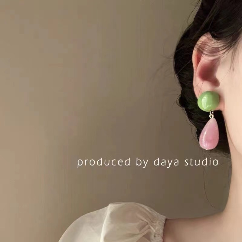S925 Silver Needle Pink and Green Contrasting Color Small Fresh Resin Earrings Niche Versatile Elegant Sweet and Cute Girl Heart Earrings