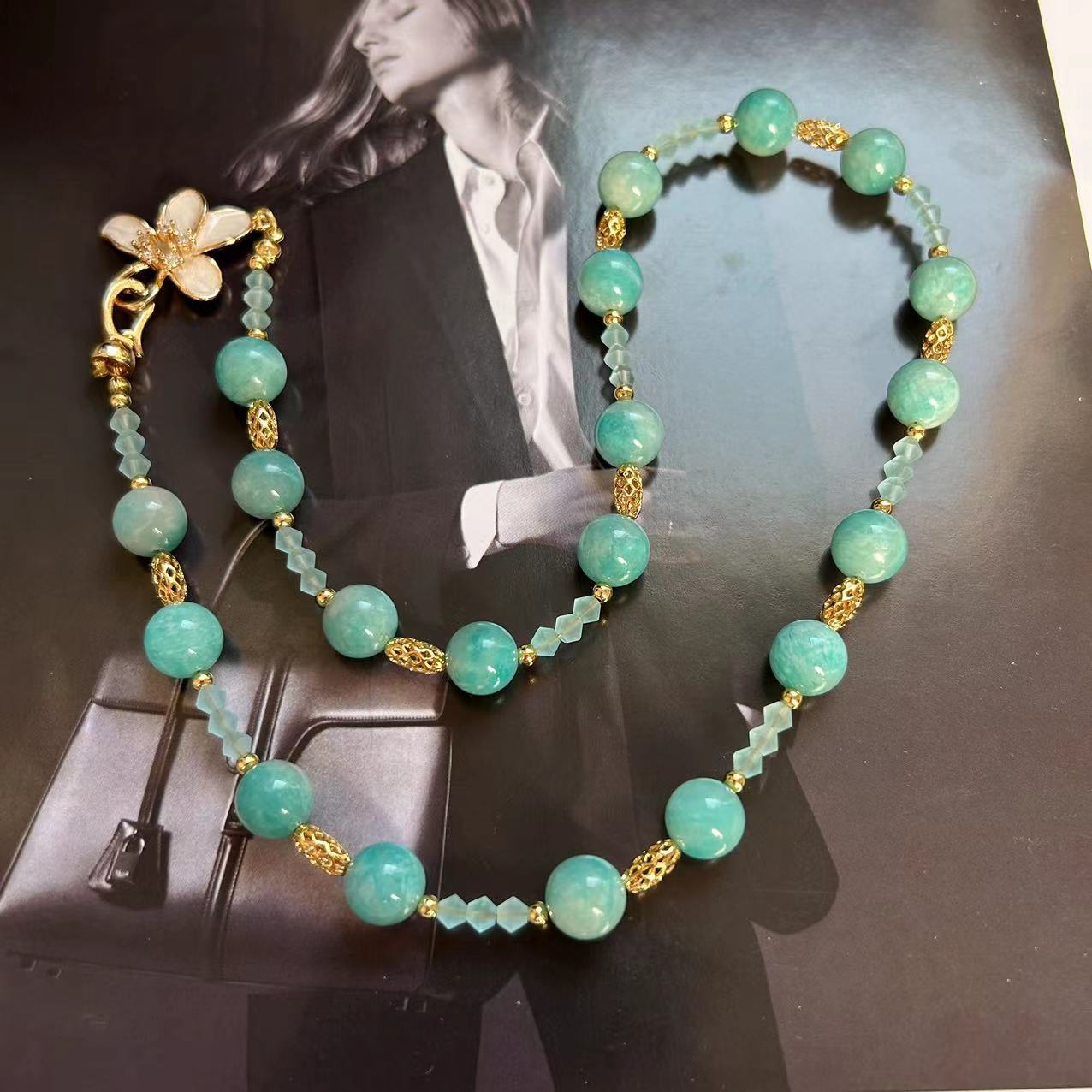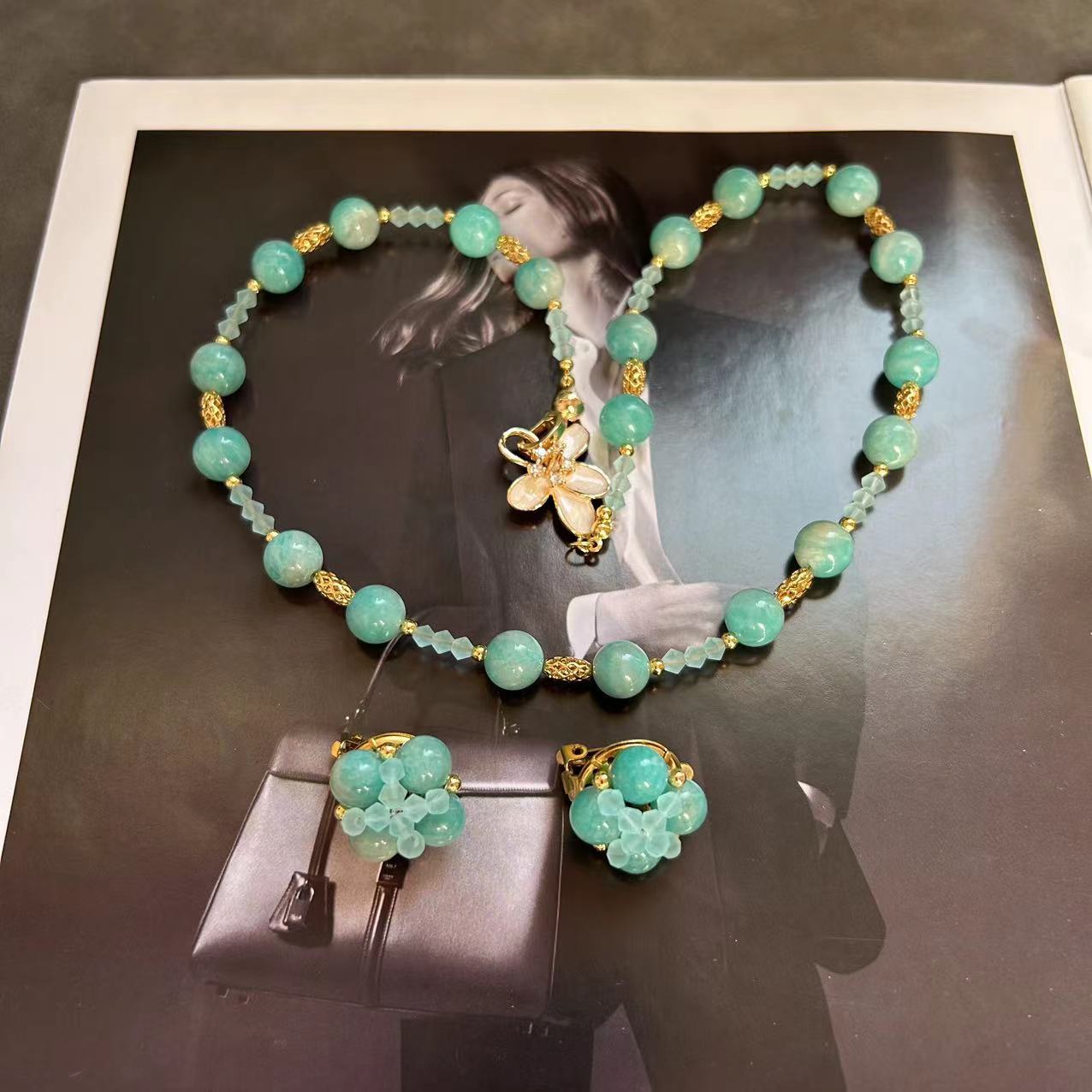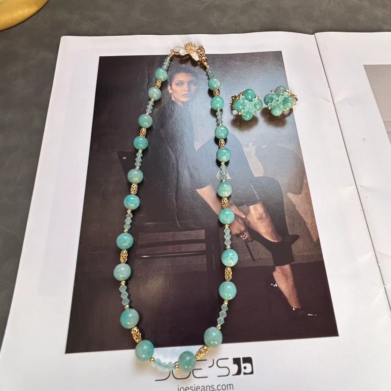 Mid-ancient jewelry electroplated real gold New Natural Stone beaded necklace earrings suit retro women's Tianhe stone necklace