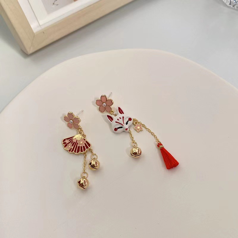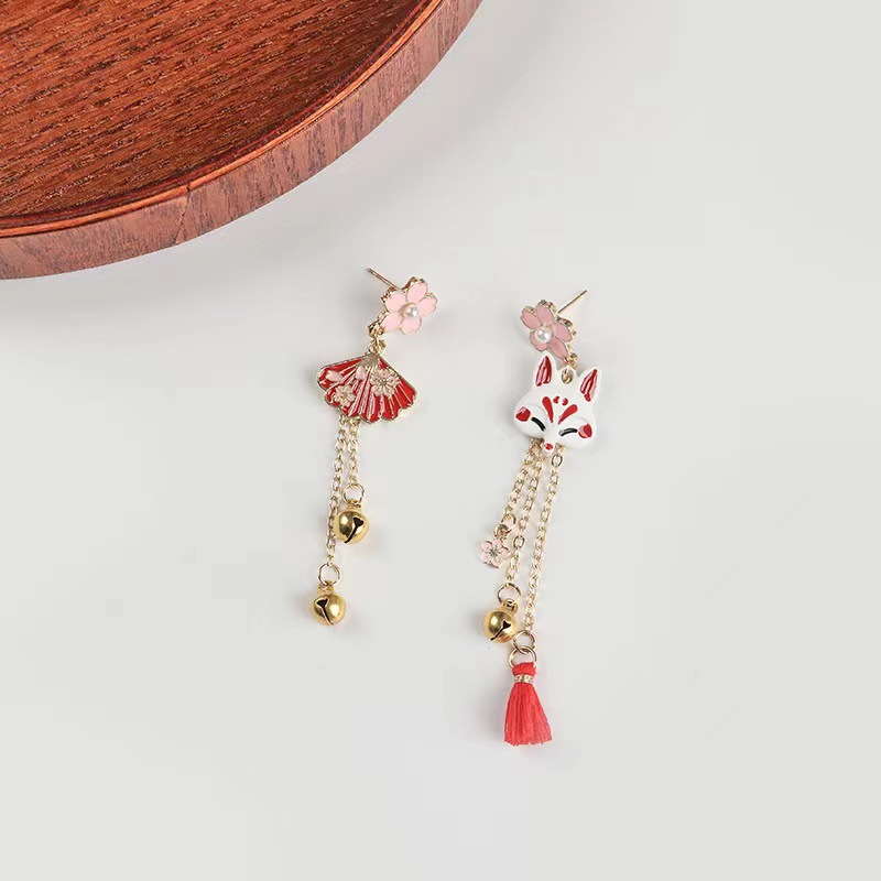 Flower Long Earrings Fox Mask Fan Earrings Tassel Earrings Fox Fan Creative Sweet Japanese and Korean Design