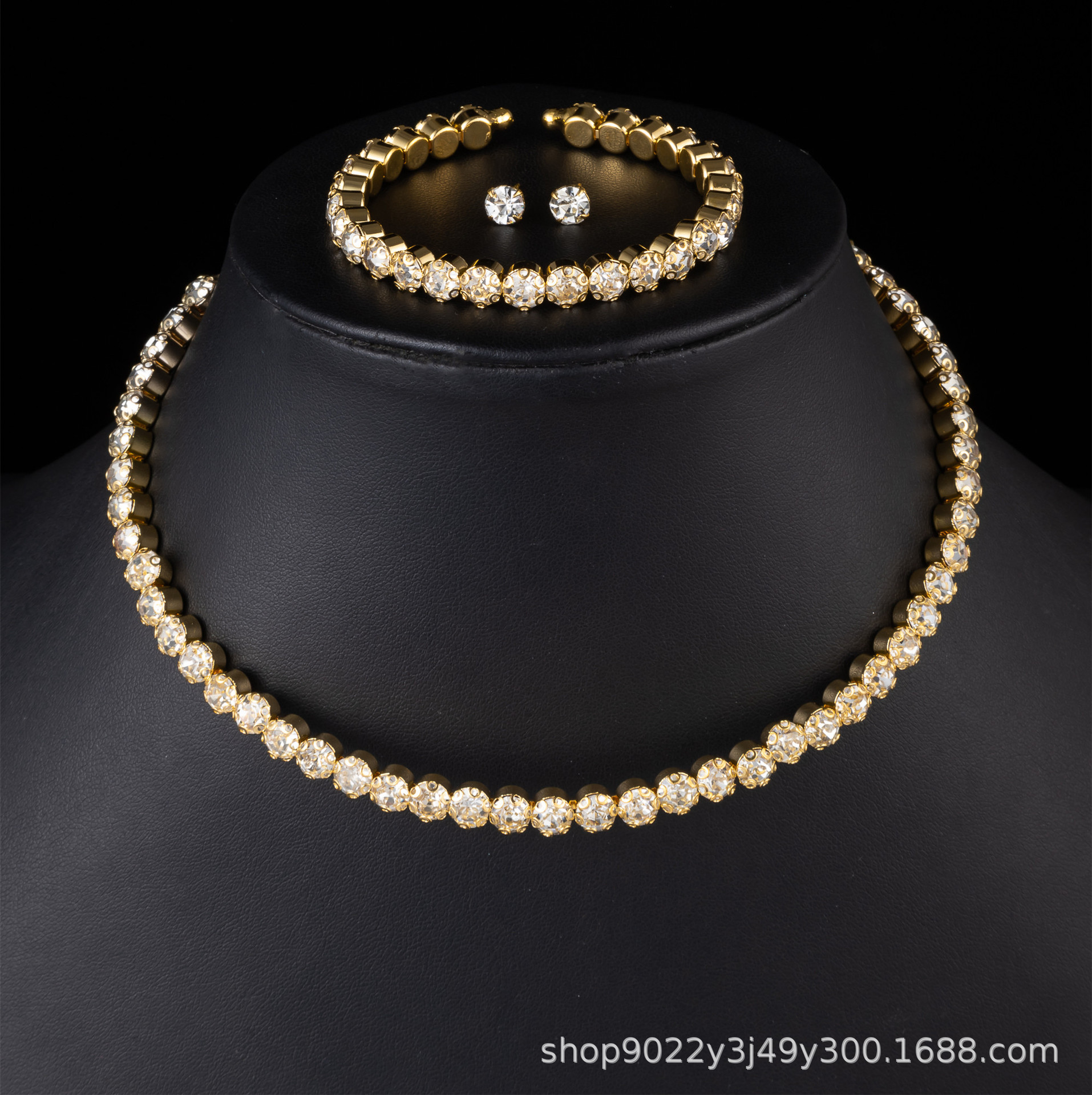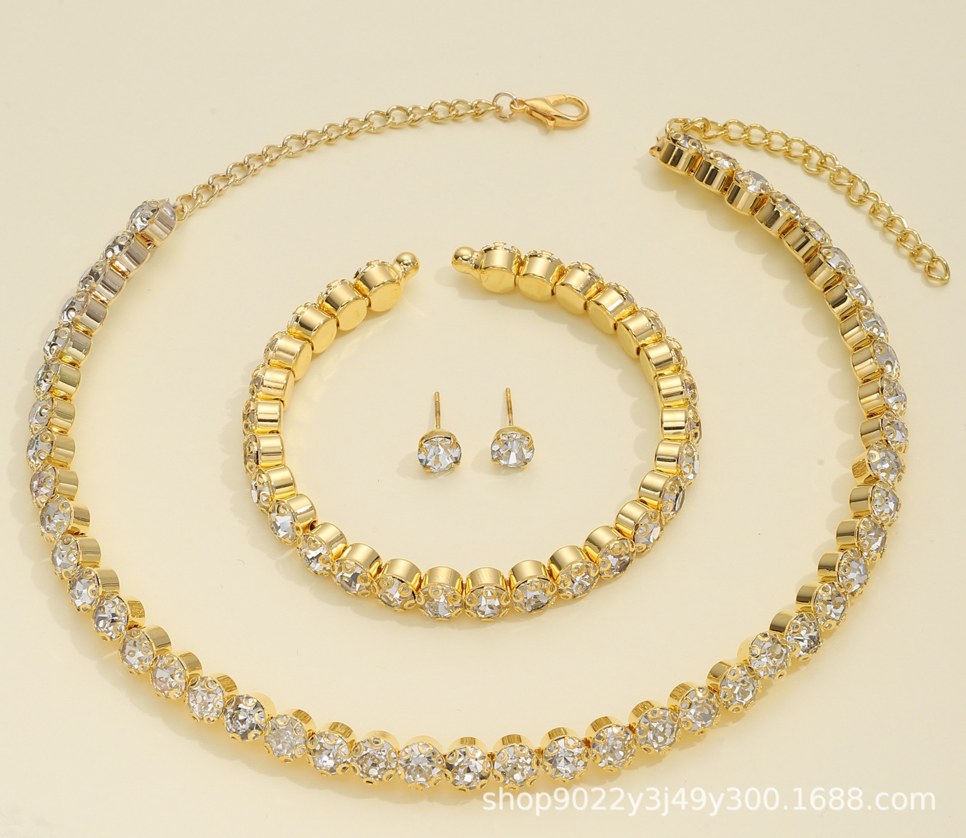 Cross-border hot sale Korean-style bright rhinestone bridal jewelry suit full diamond necklace earrings bracelet three pieces suit accessories