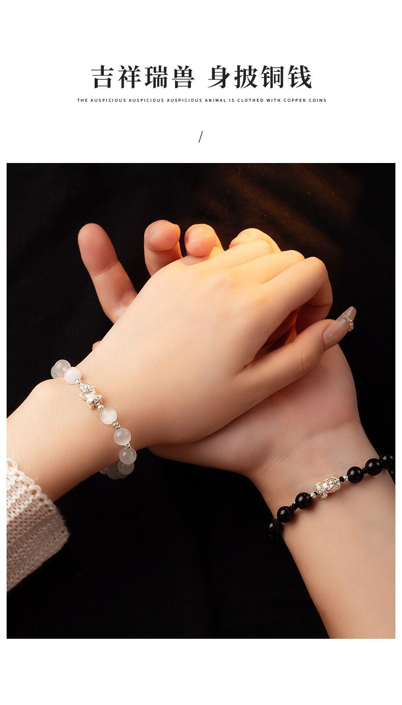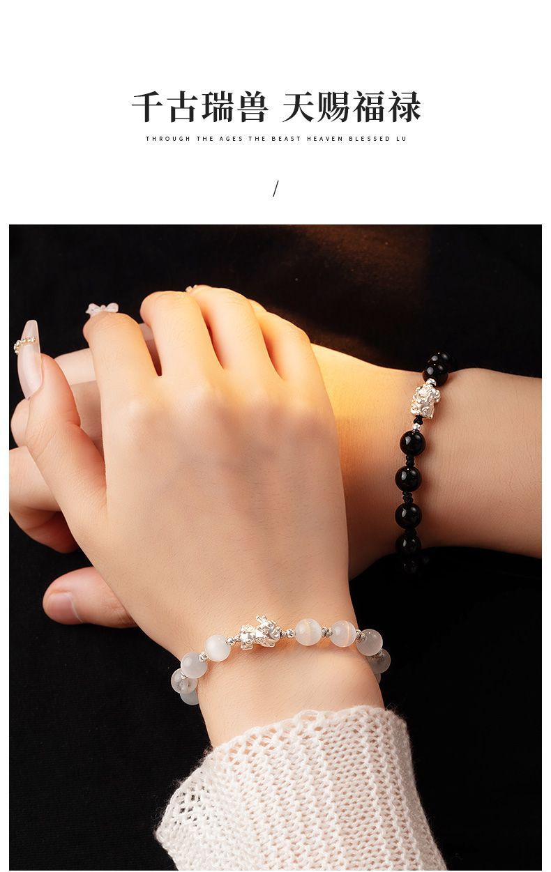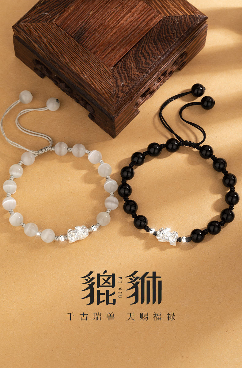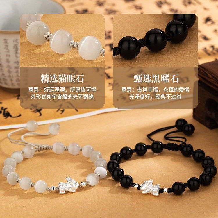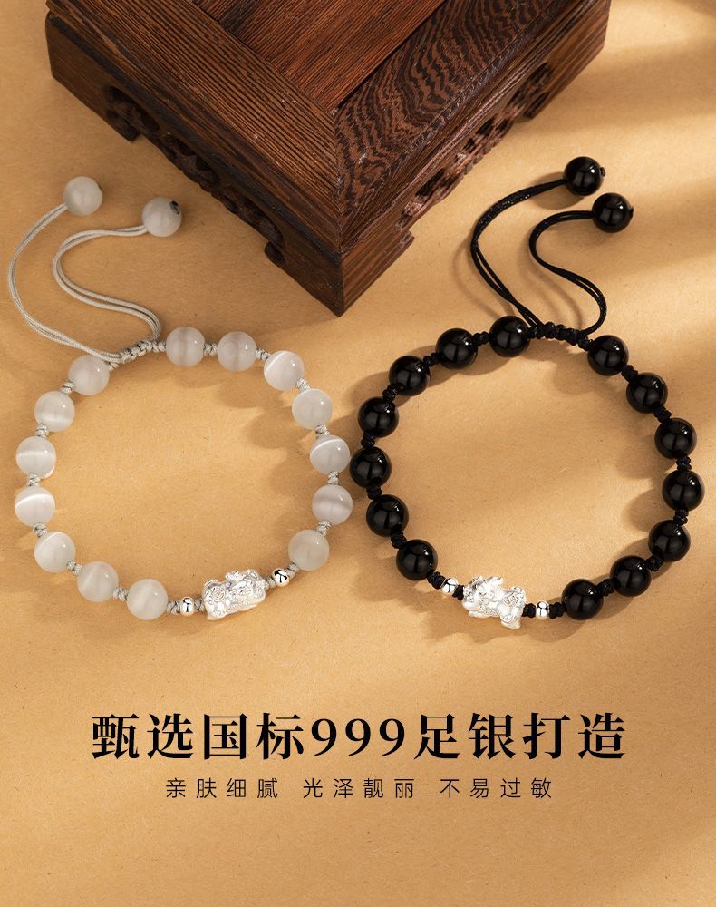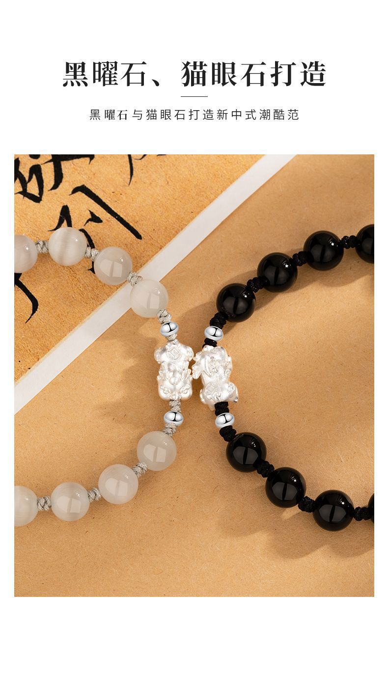 Sterling Silver Pi Xiu Cat's Eye Obsidian Bracelet Couple's Niche High-end Men's Beaded Birthday Gift Wholesale