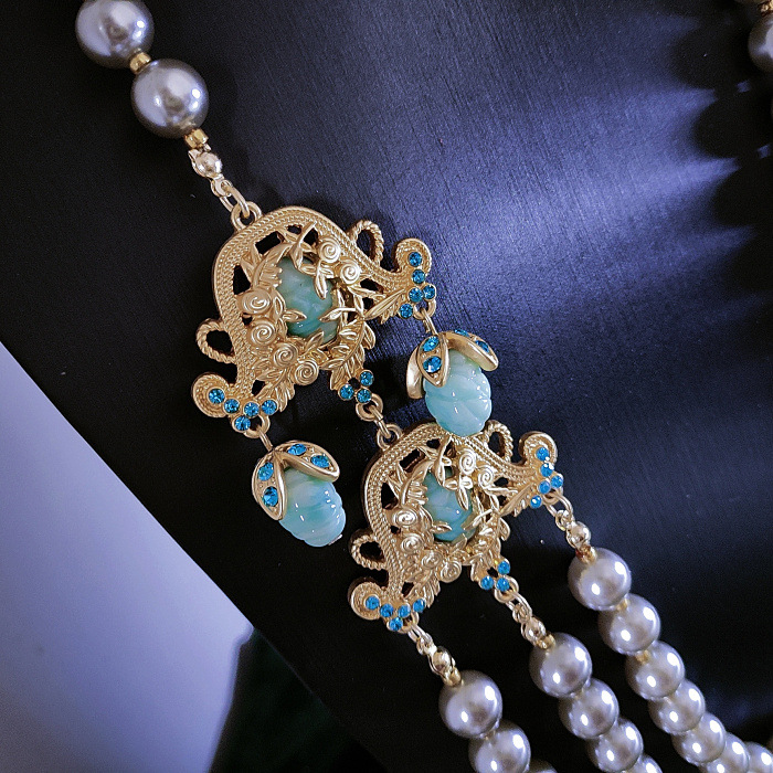 A small amount of in Stock + thick gold plating craft] vintage medieval blue tassel earrings multi-layer gray pearl necklace