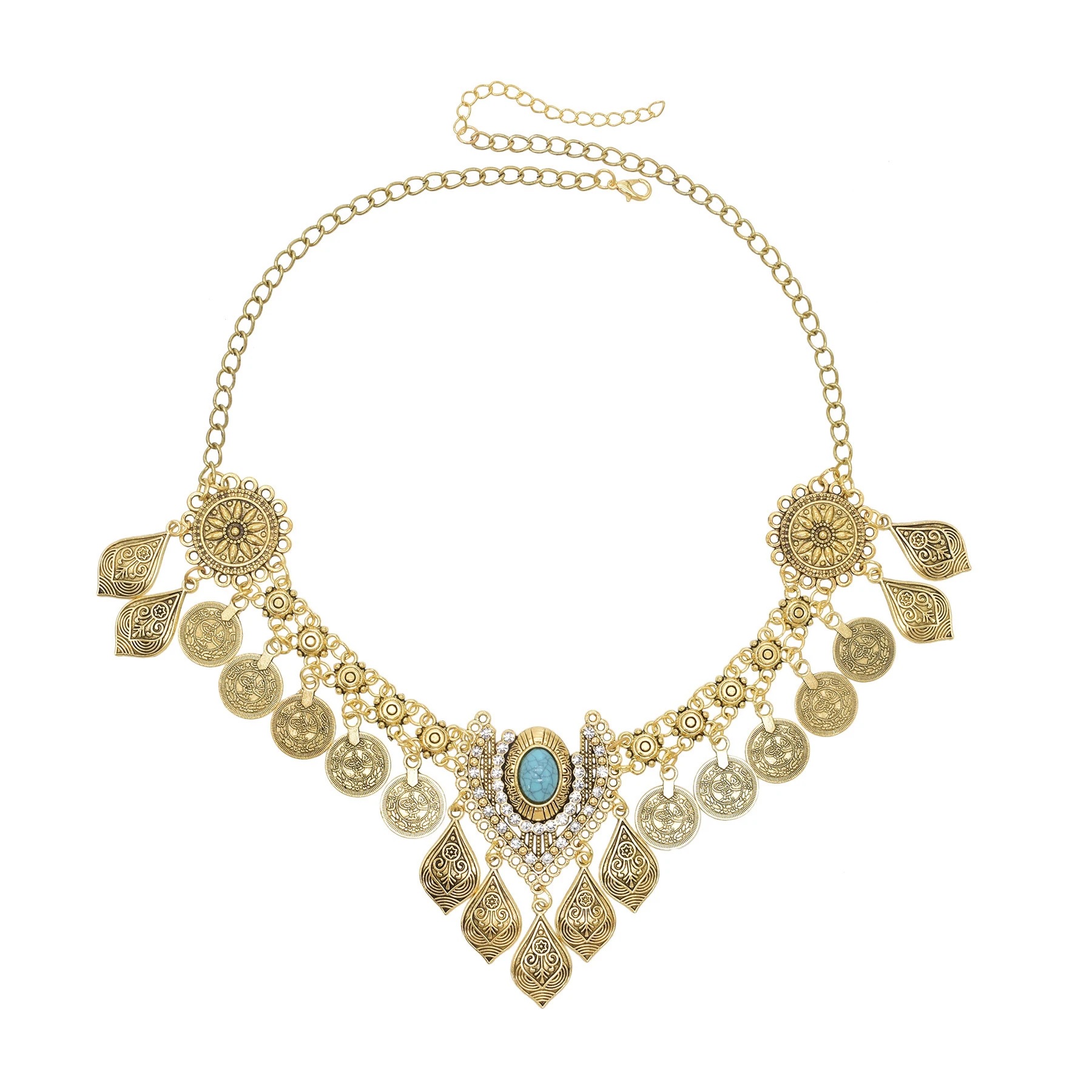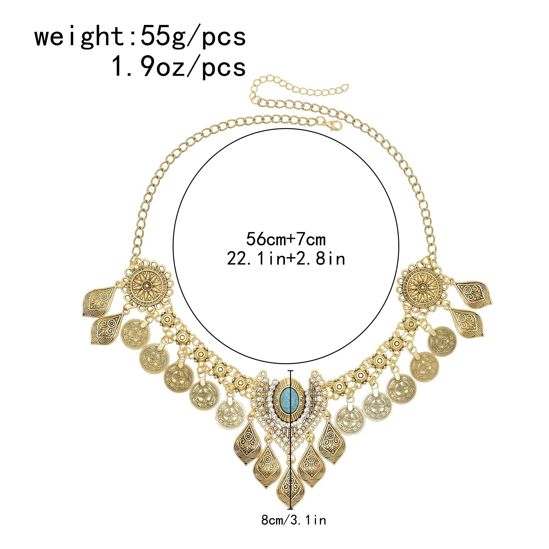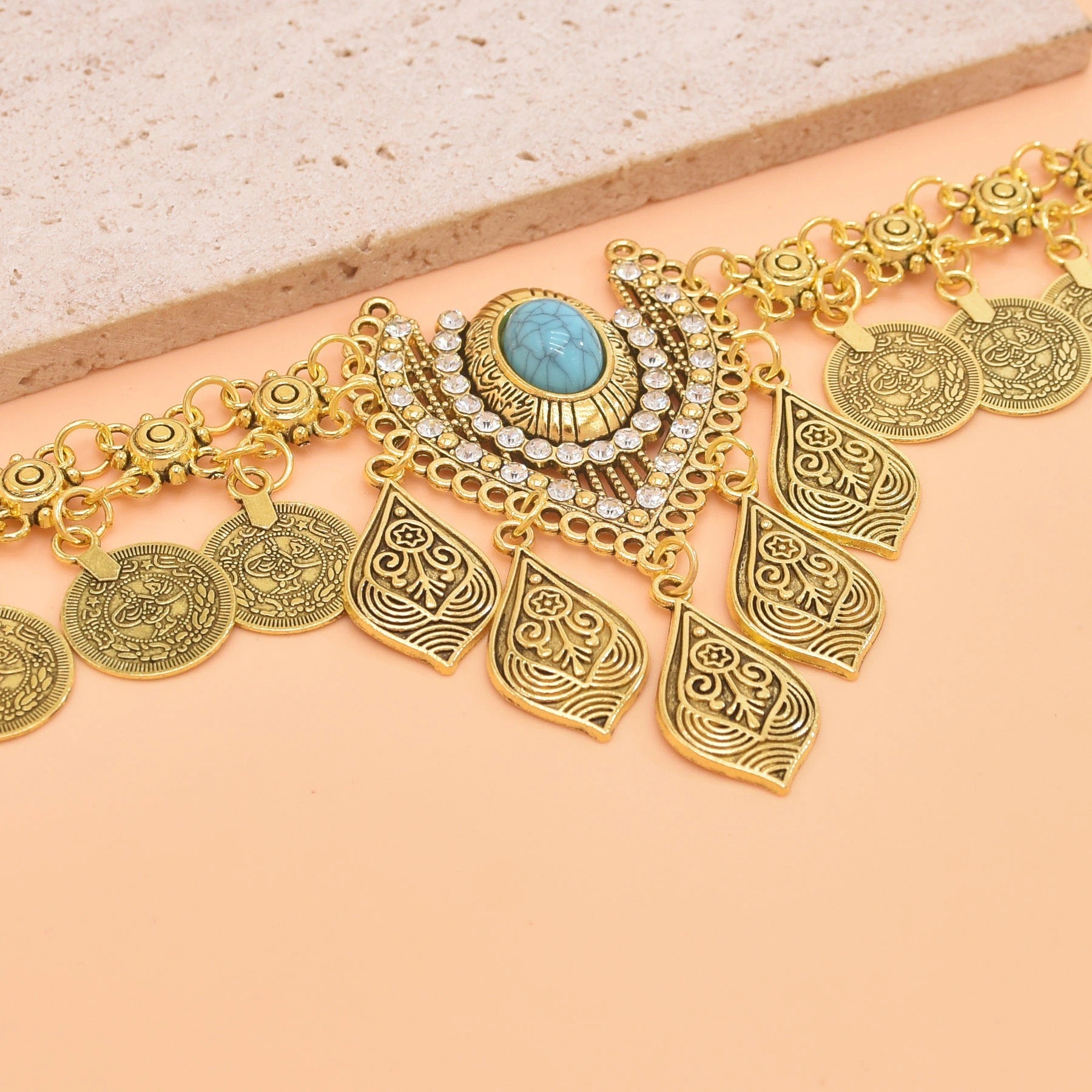 【名称】:哈萨克民族钱币项链复古镶嵌水钻仿松石毛衣链头饰两用