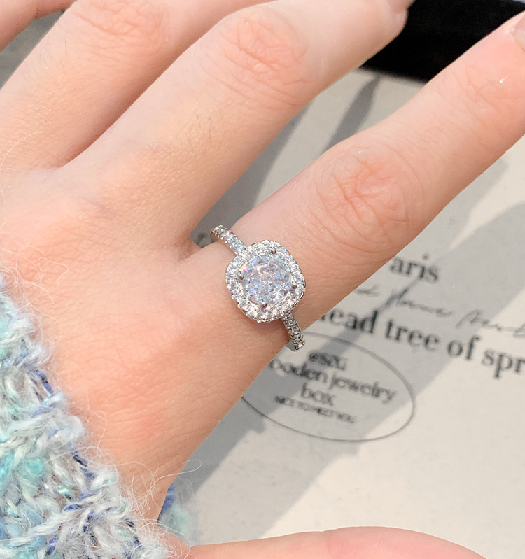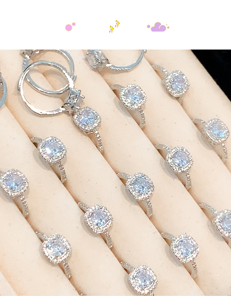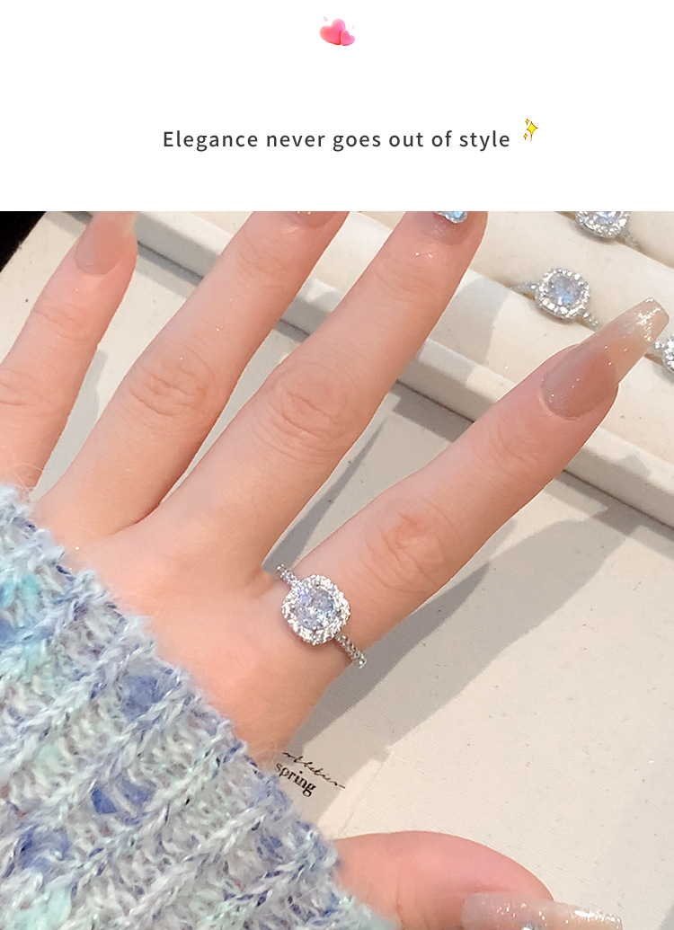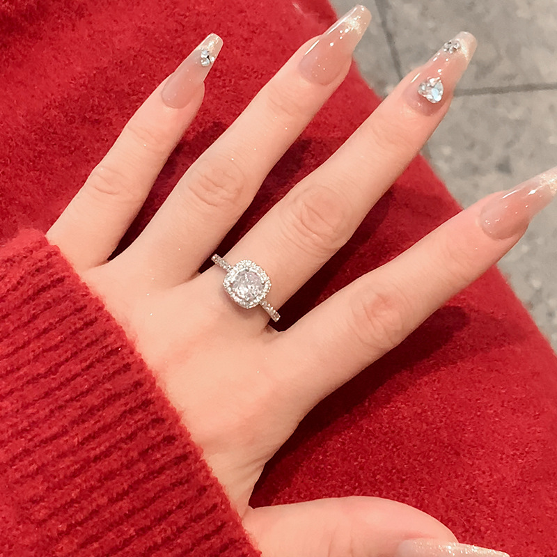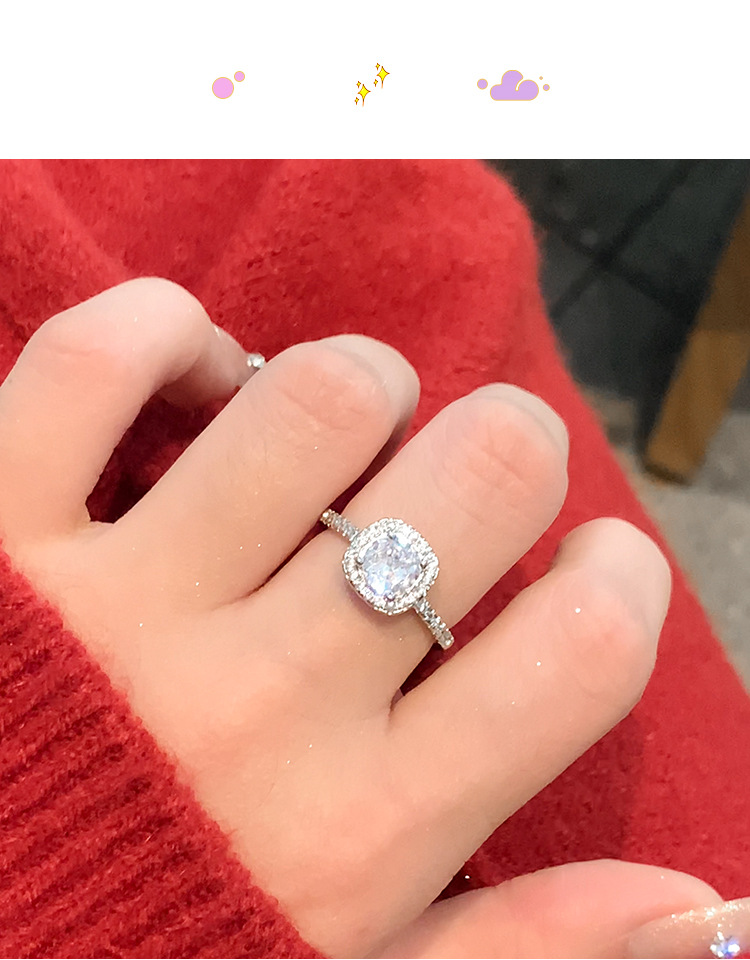 Silver-Plated Copper Small Square Sugar Ring for Women, Light Luxury High-End Minimalist Band Ring, Niche Design Tail Ring with Rhinestones, Index Finger Ring