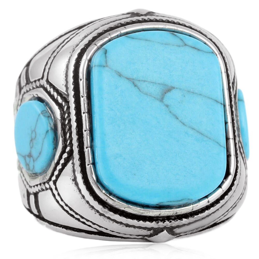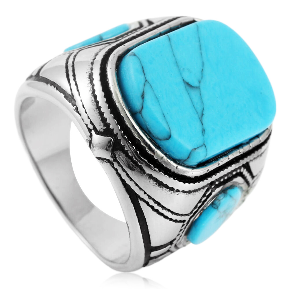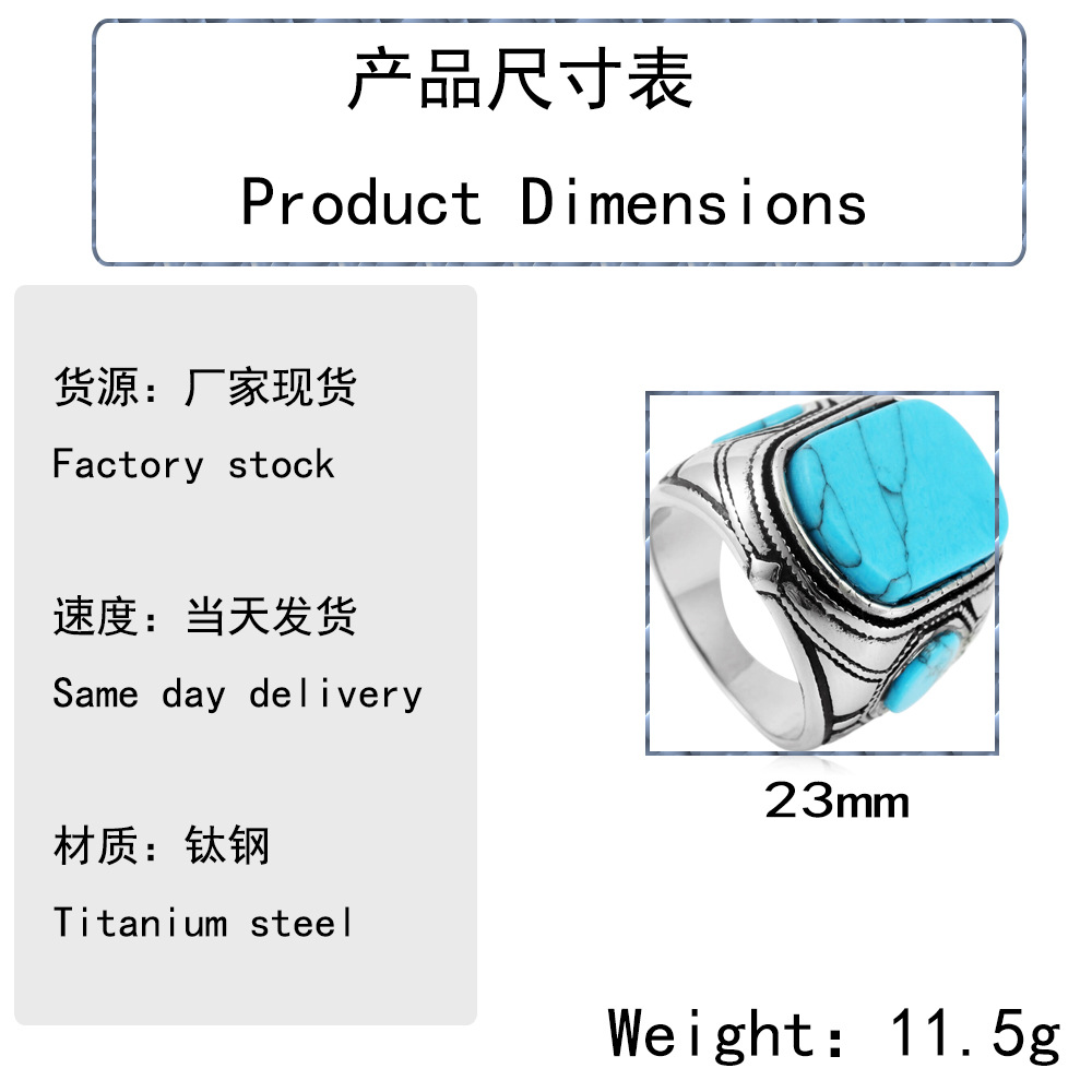 Turquoise Pattern European and American Blue Turquoise Men's Titanium Steel Ring Trendy Hip-hop Rap Personality Retro Court Couple's Ring