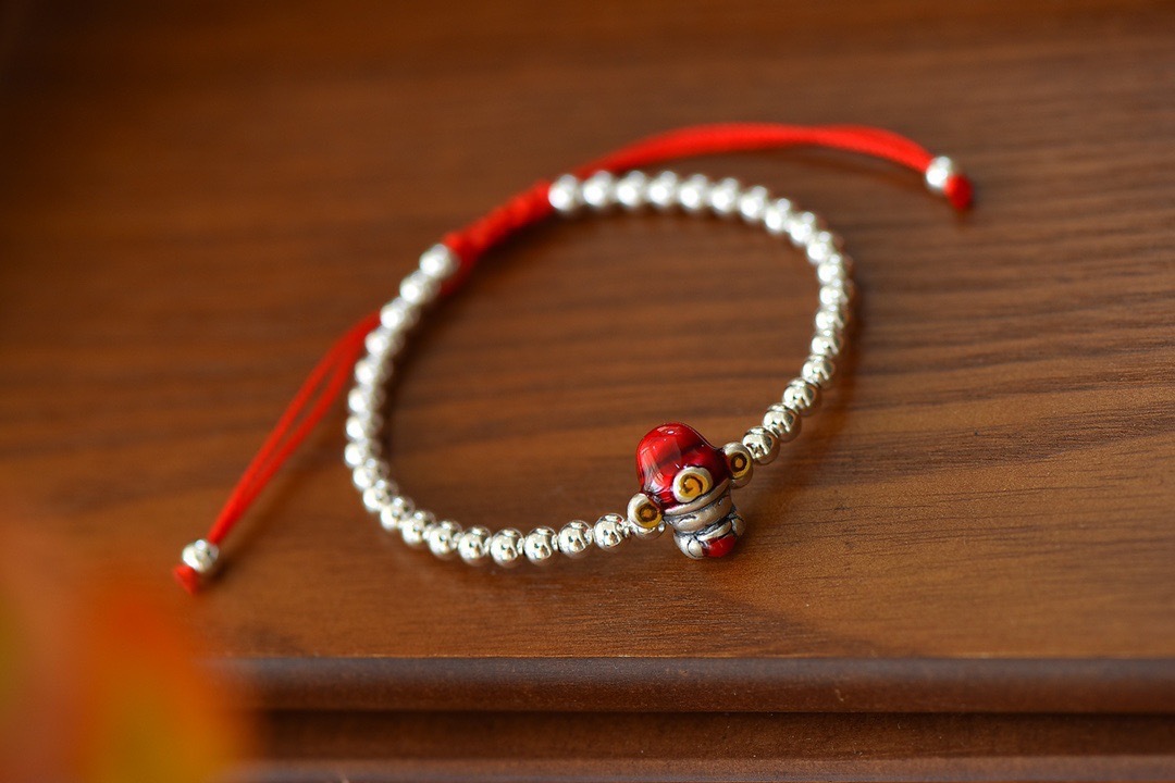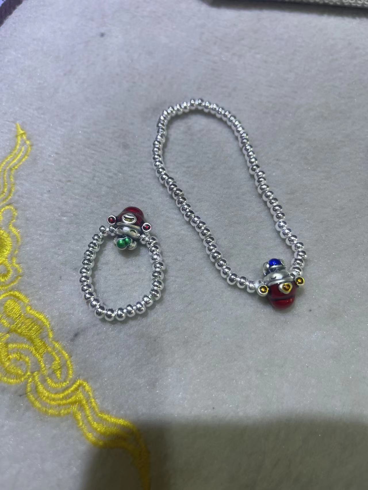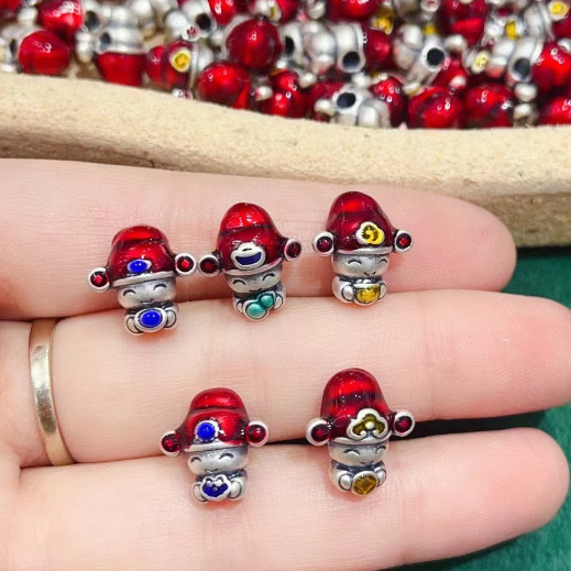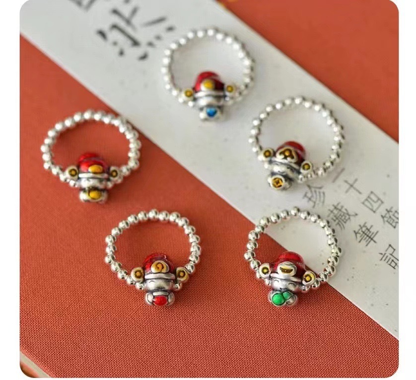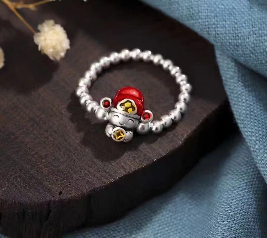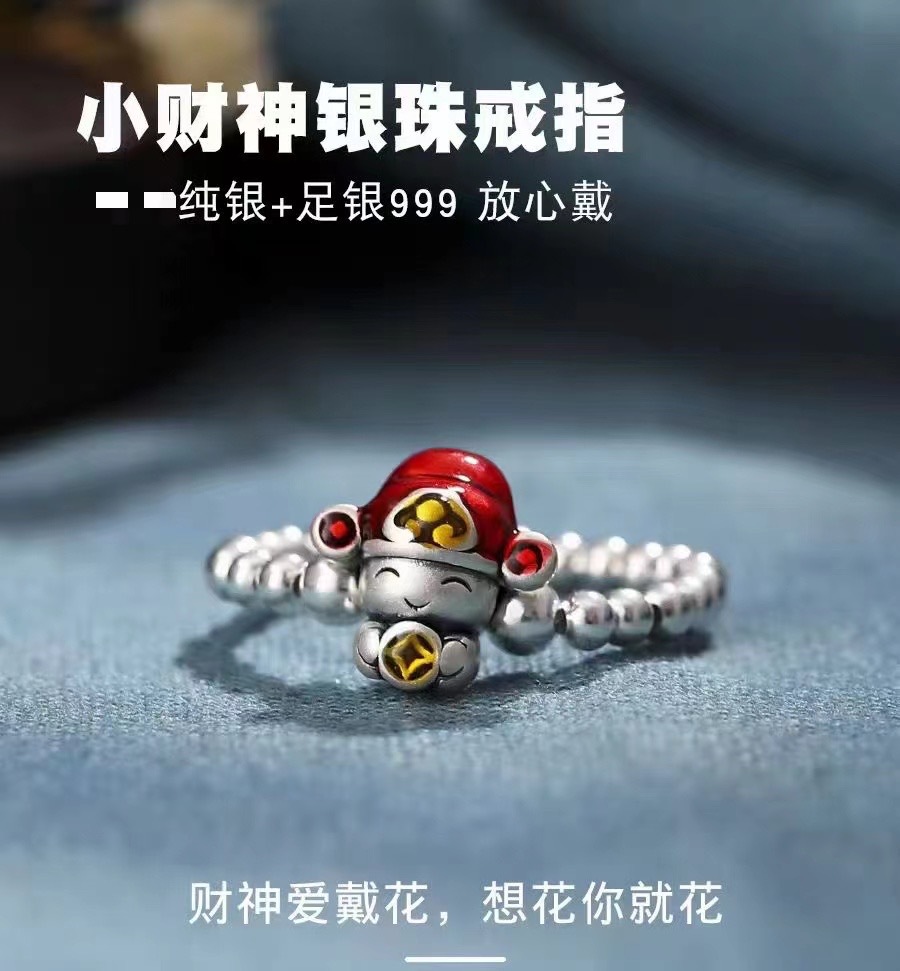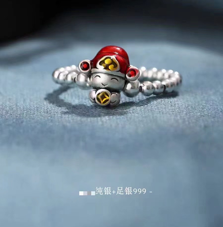 Pure Silver S999 small God of Wealth ring ring niche design silver beads New Year color epoxy God of Wealth elastic ring