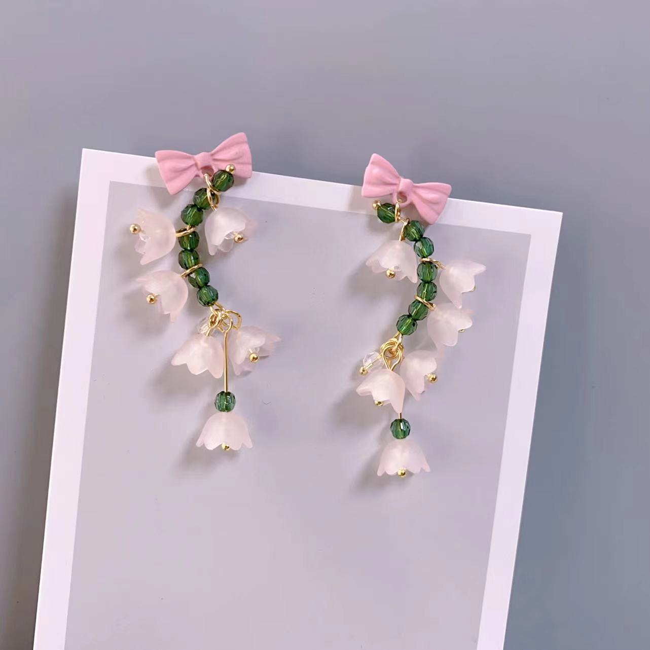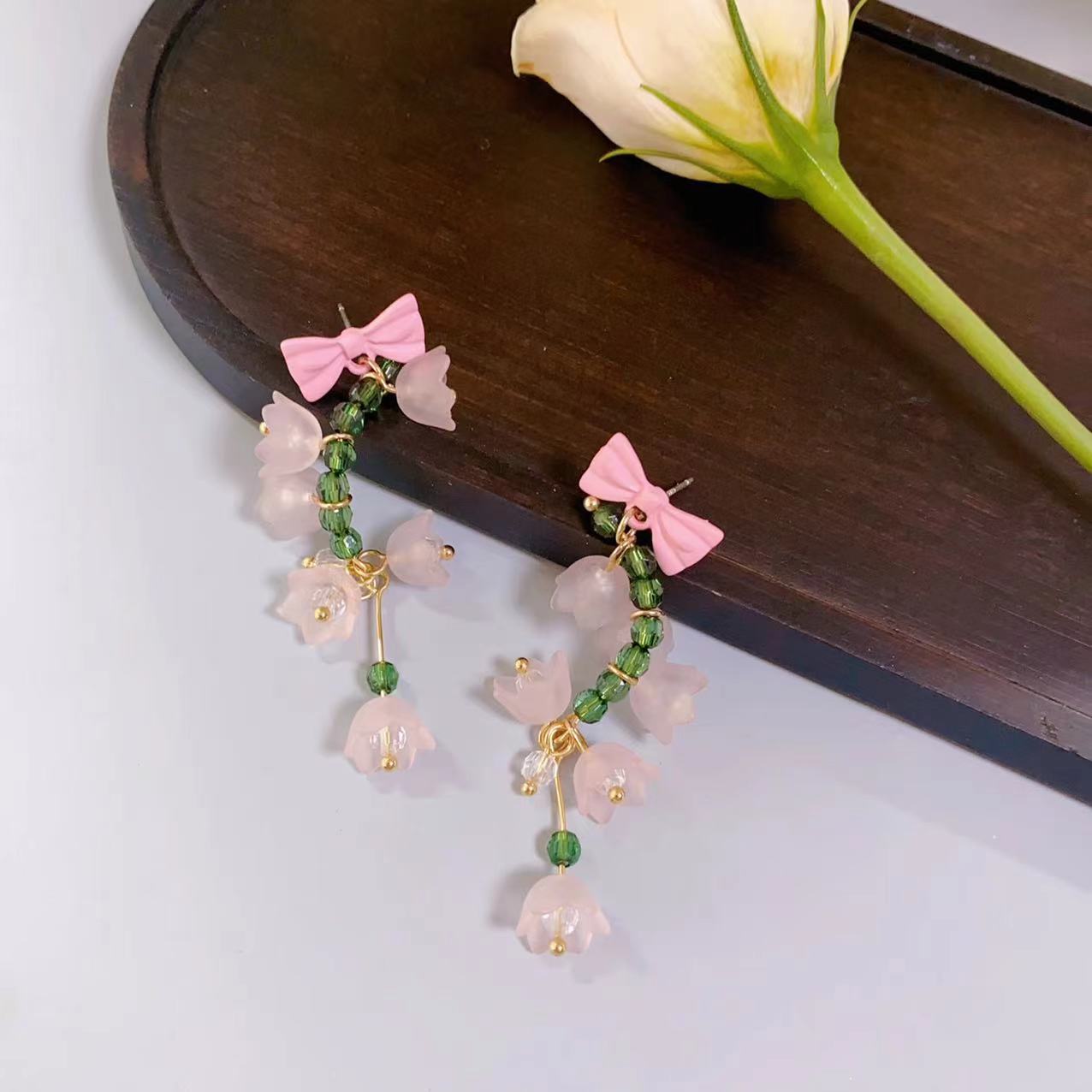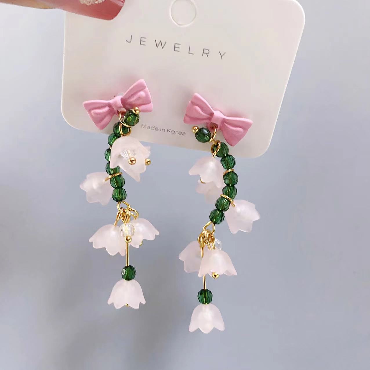 Fresh orchid long tassel earrings Mori girl ins pastoral style bow earrings beaded earrings