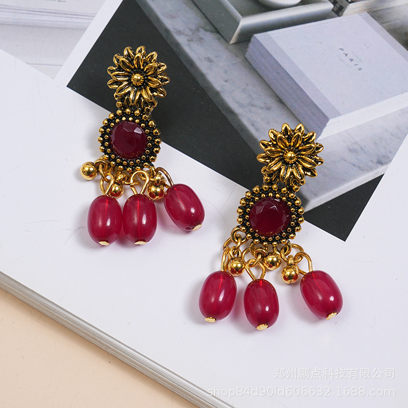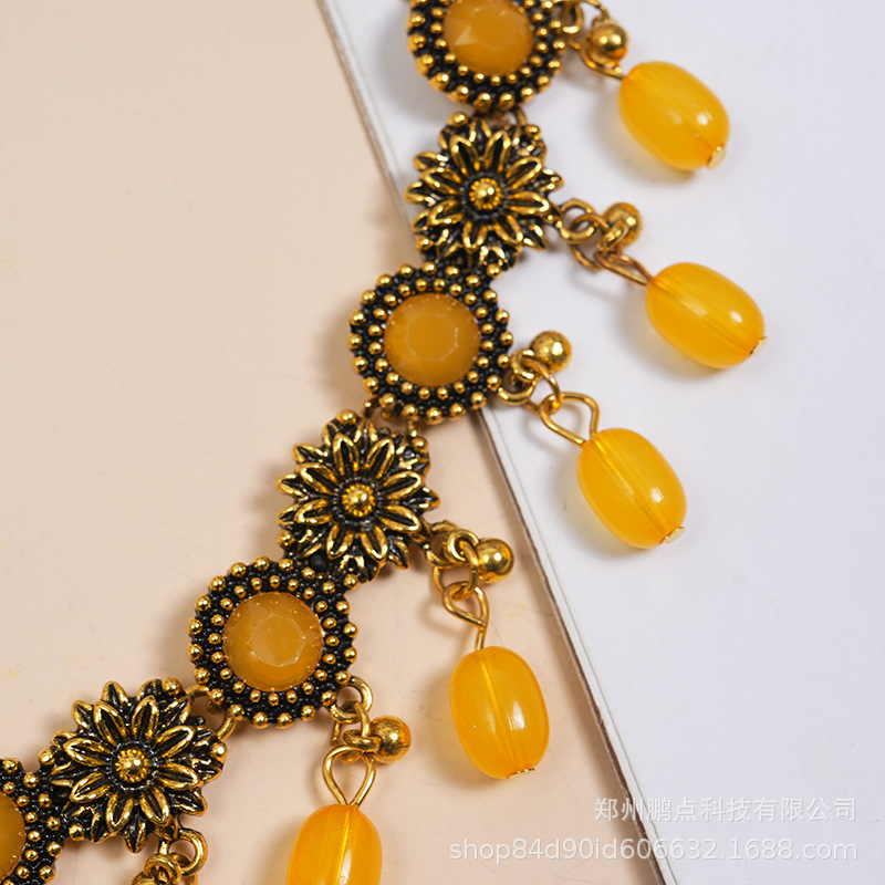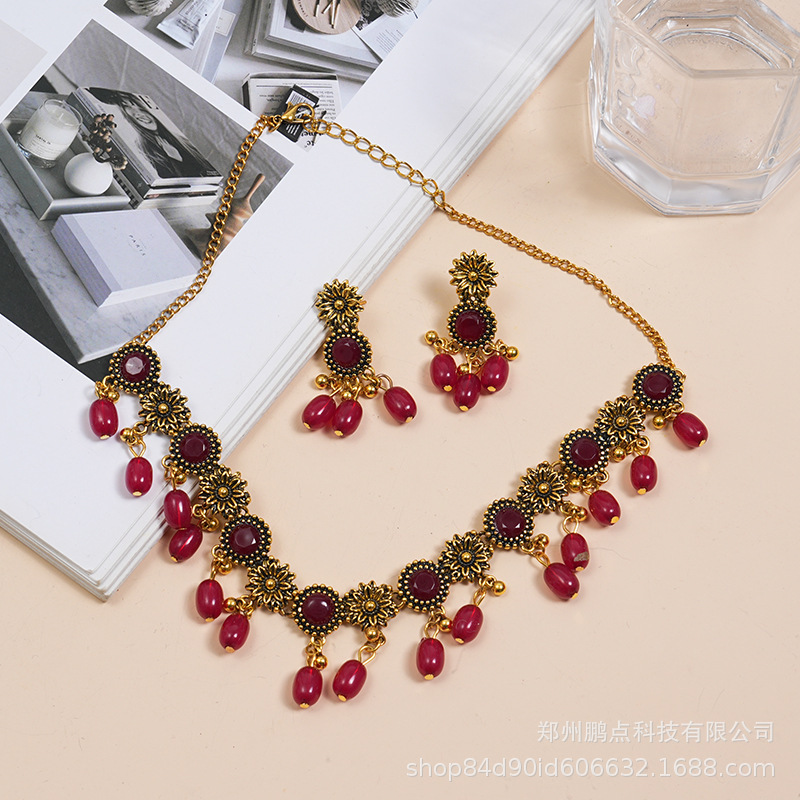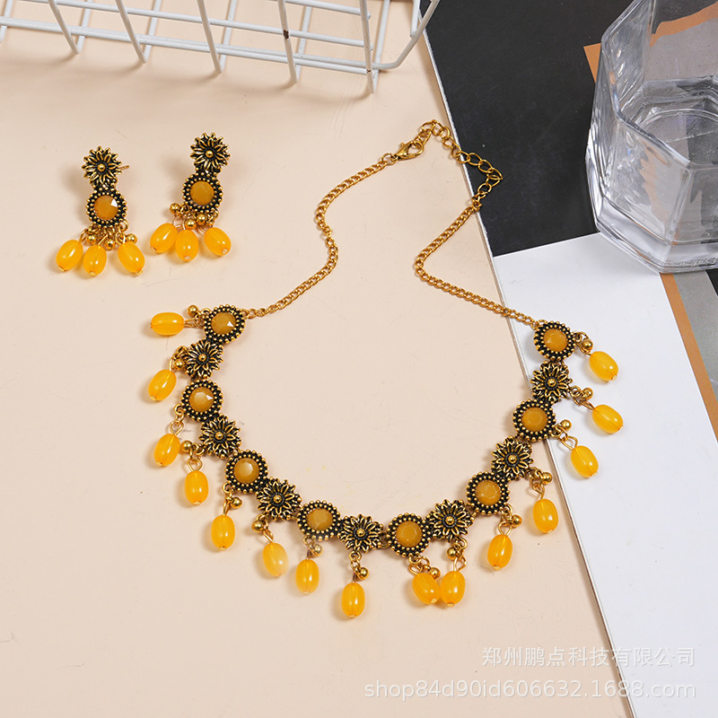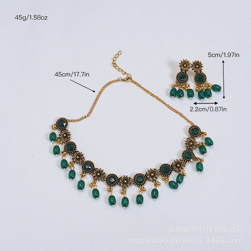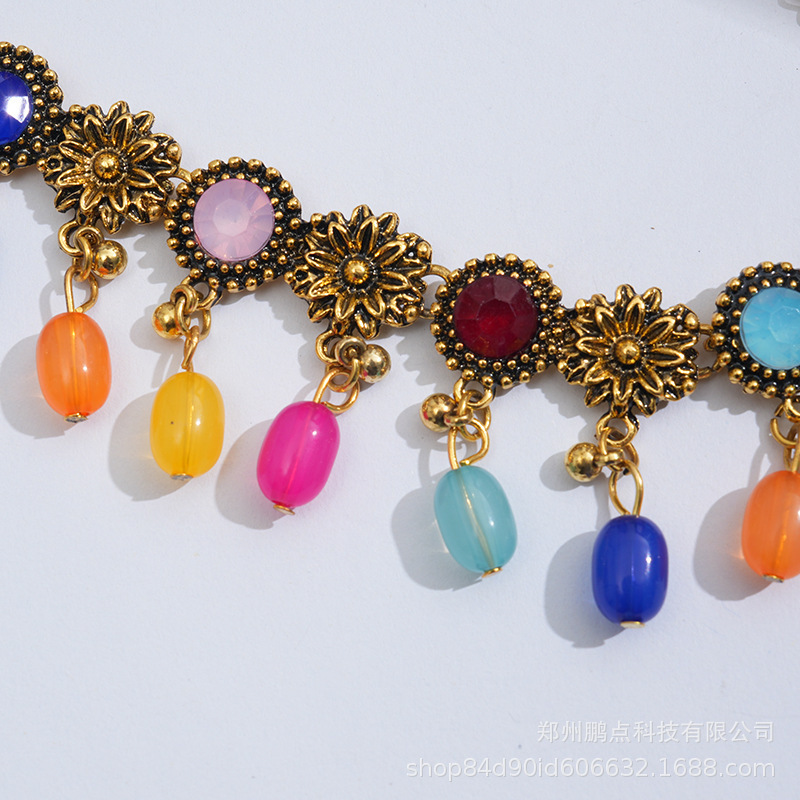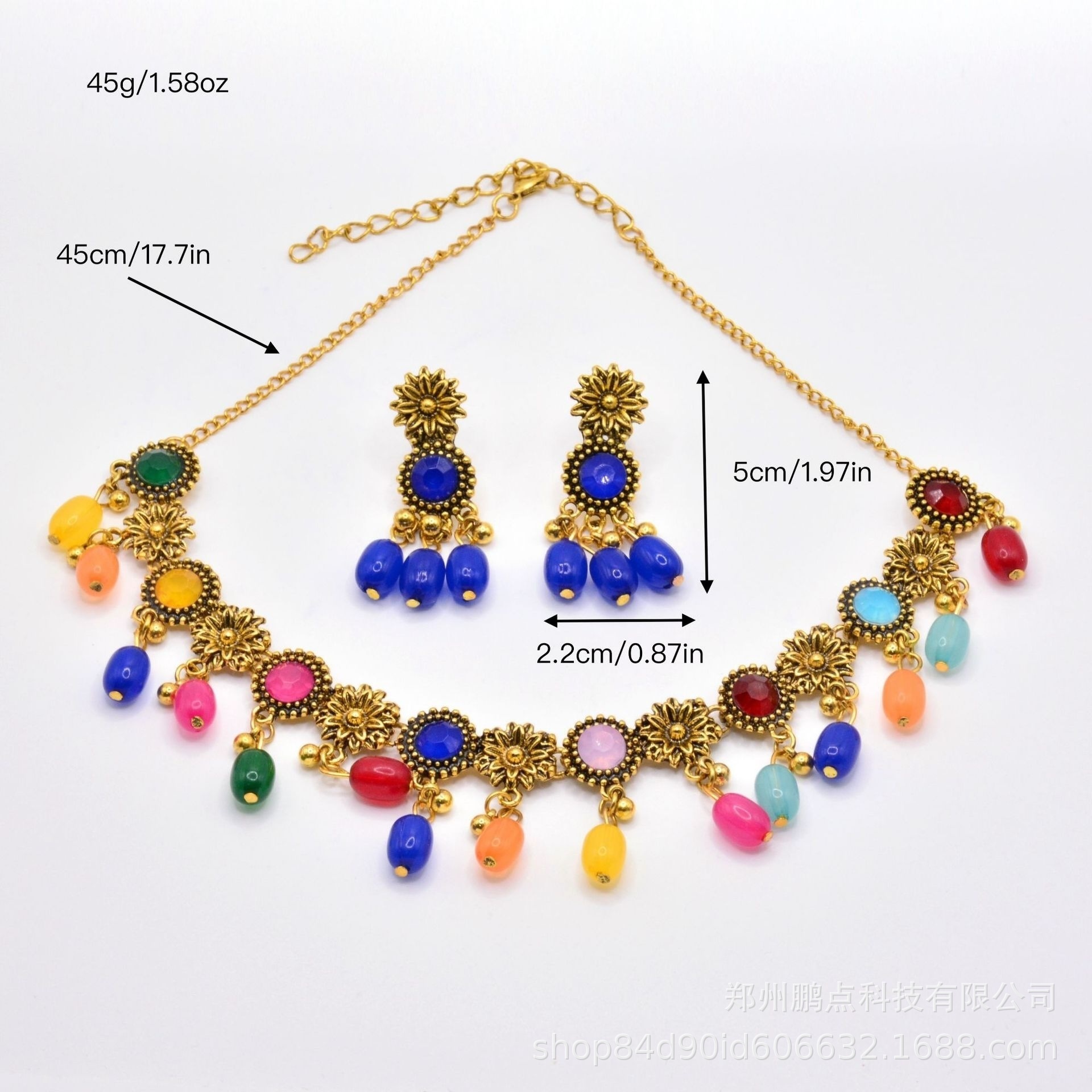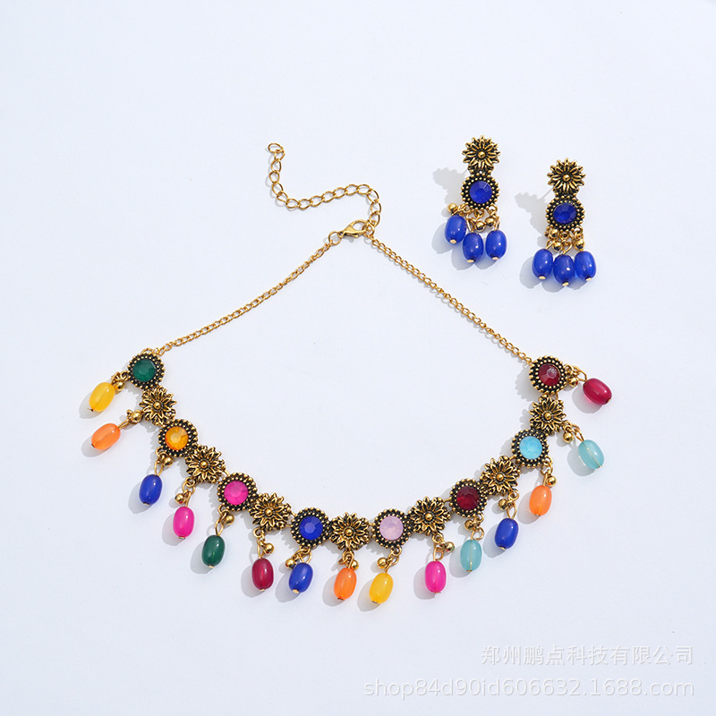 B018 Europe, America and India Cross-border Retro Ancient Gold Colorful Necklace Earrings suit Oil Drops Rhinestone Exaggerated Fashion Women