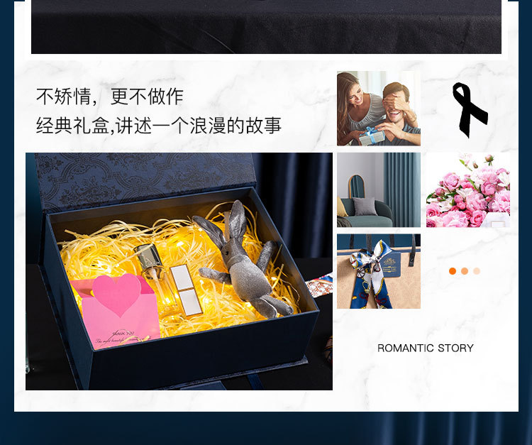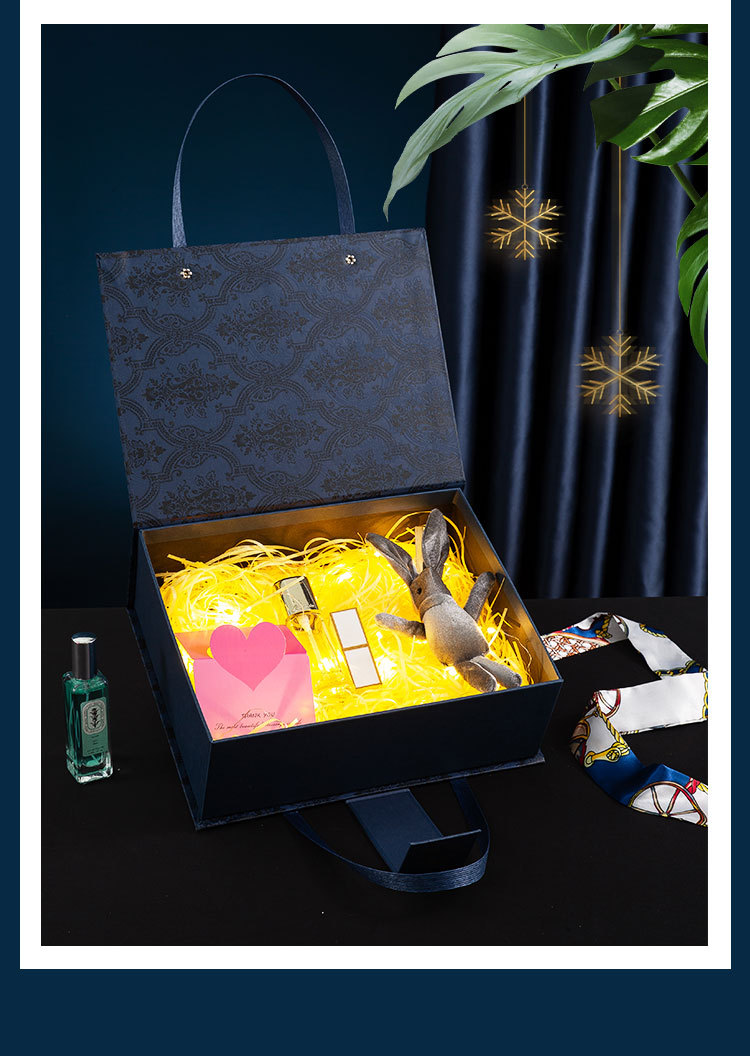 Specification model: Elegant blue pattern + raffia + silk scarf + wishing rabbit + Lantern + greeting card; Small size 18*13*6.5
