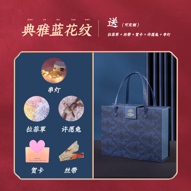 Specification model: Elegant blue pattern + raffia + silk scarf + wishing rabbit + Lantern + greeting card; Large size 34*25 * 9.5cm