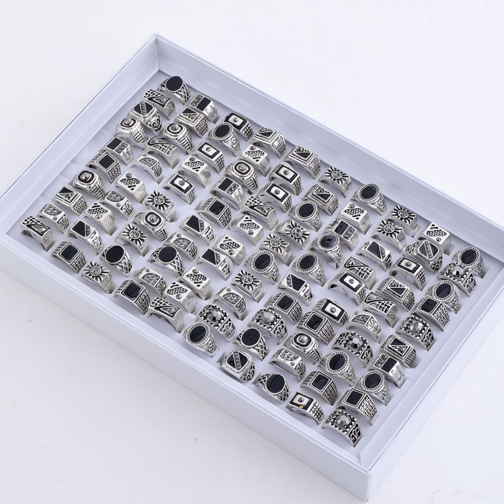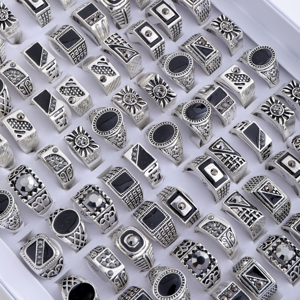 European and American Style Vintage Silver-Plated Men's Ring with Black Accessories, Versatile and Simple Index Finger Ring, Mixed Styles Wholesale