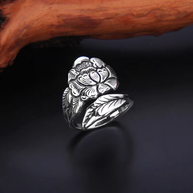 Thai Silver Vintage Ethnic Peony Flower Ring Women's Handmade Classical Antique Art Vintage Adjustable Ring