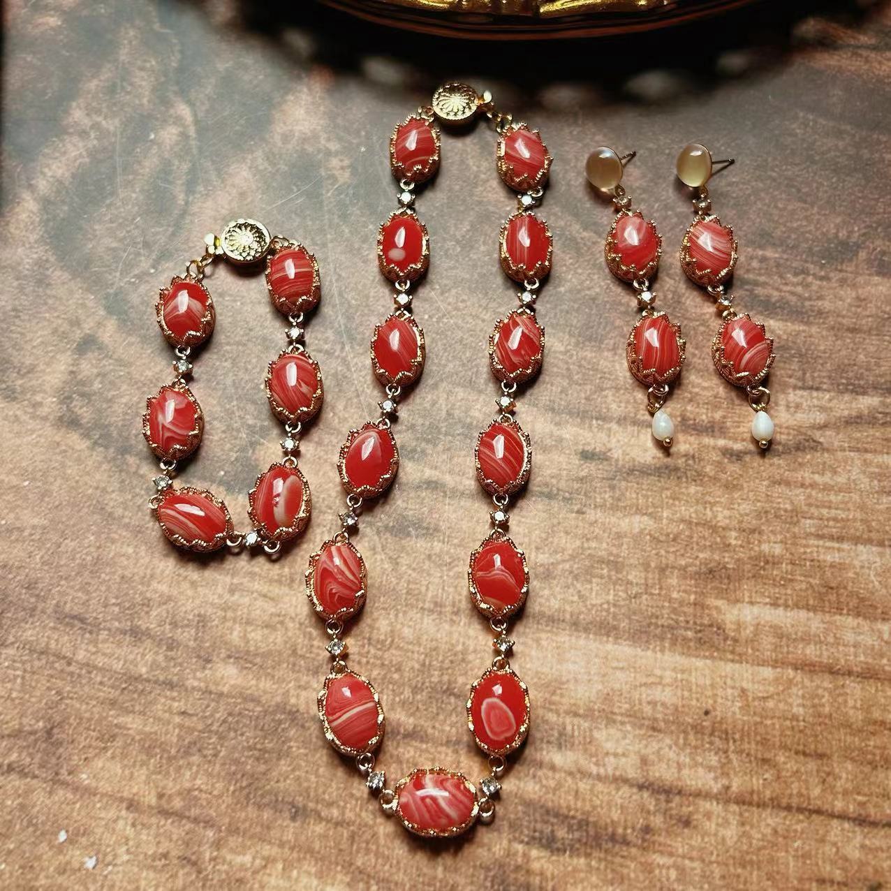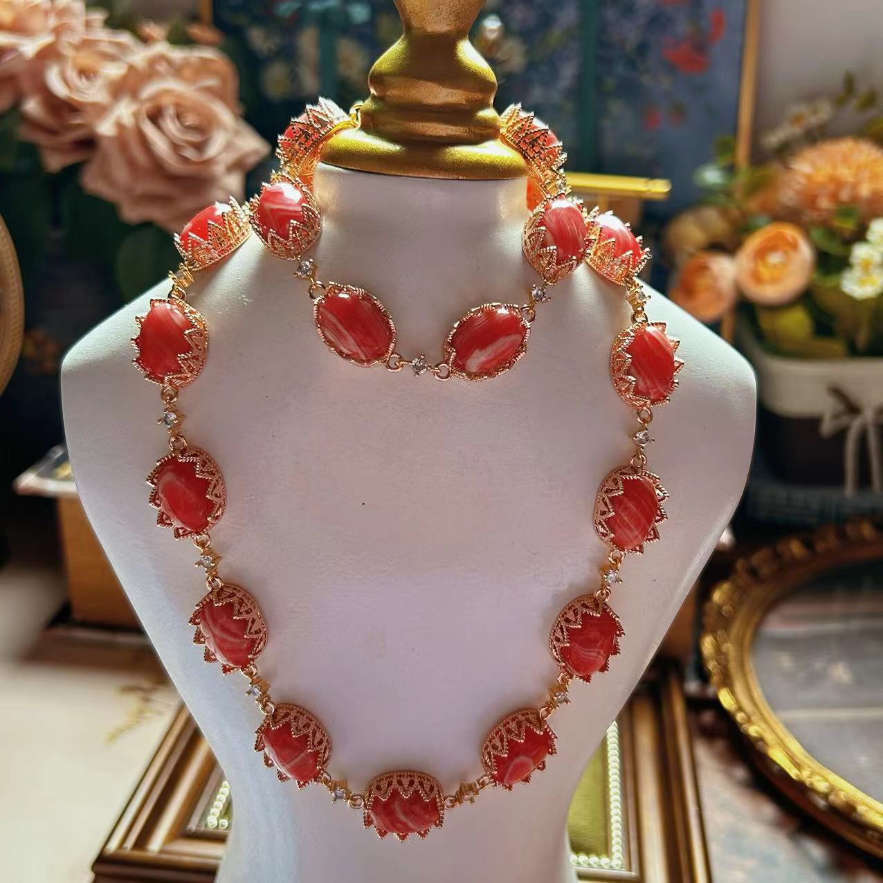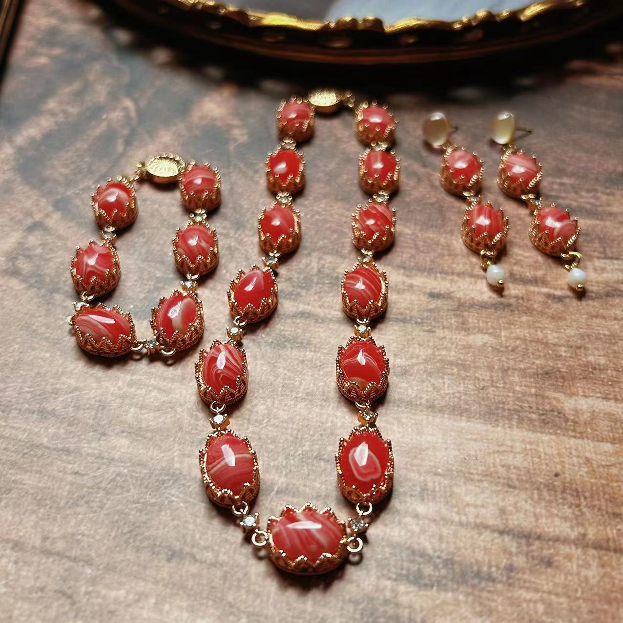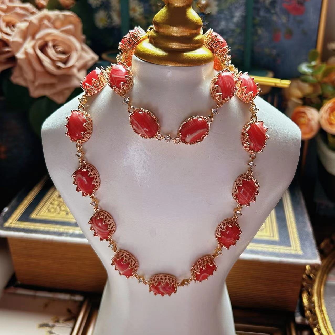 Middle Ancient vintage Jewelry Western Antique Red Stone Copper Plated Real Gold High-grade French Necklace Earrings Set