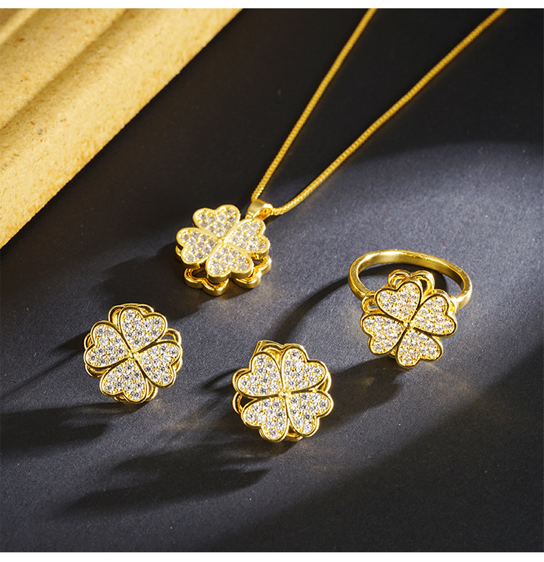 New Ins Four-leaf Clover Full Diamond Popular Necklace Ring Set Earrings Vietnam Sand Gold Copper Alloy Color Preservation