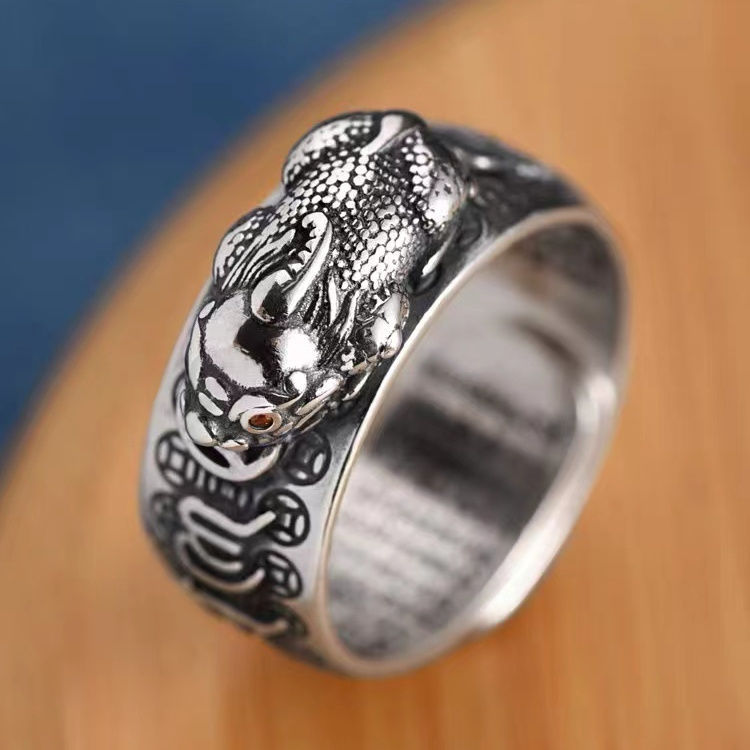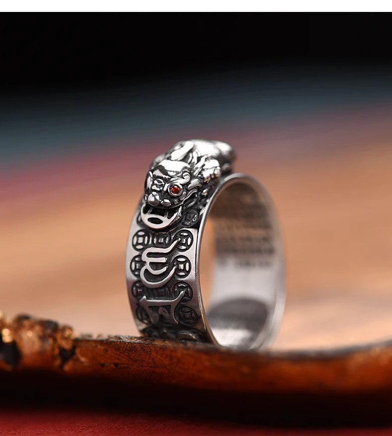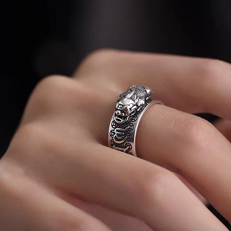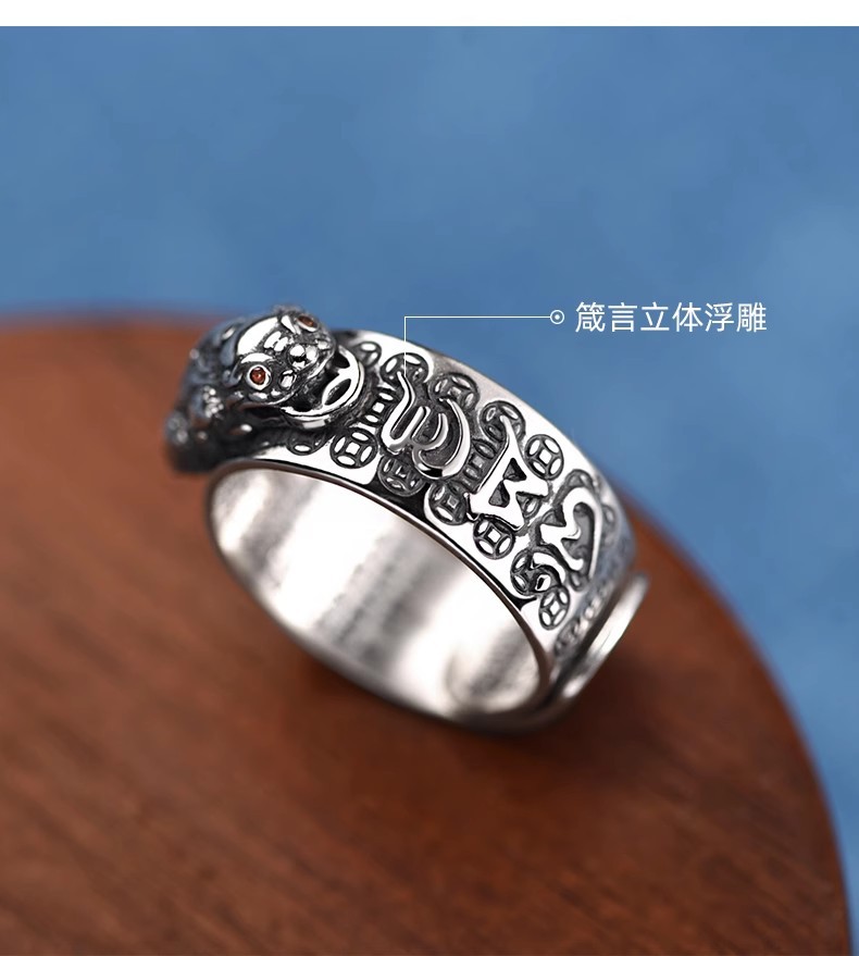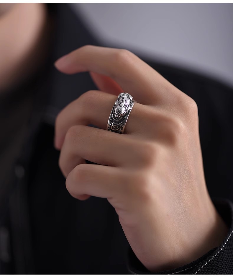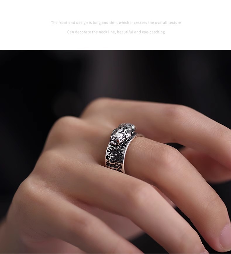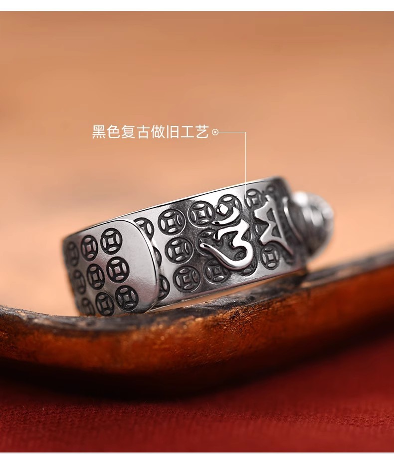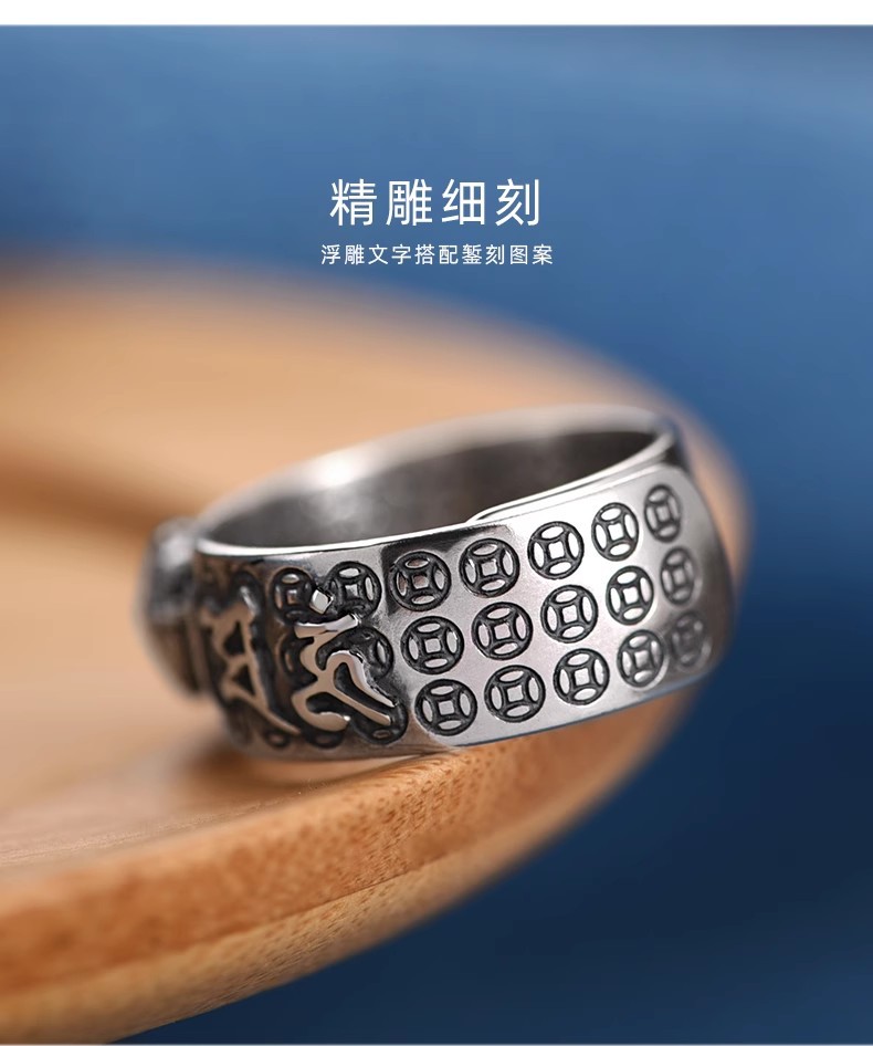 Retro Thai silver six-character truth heart sutra fortune transfer brave men's ring personality domineering hip-hop open ring