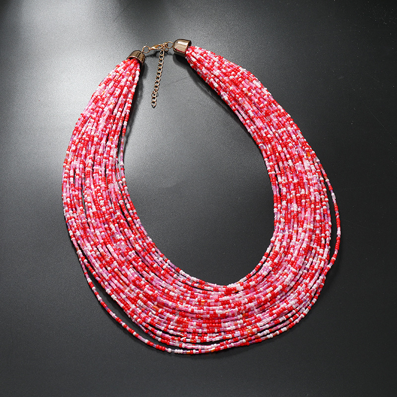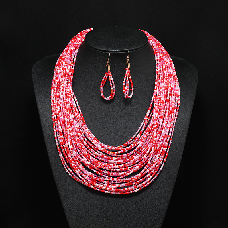 Bohemian multi-layer rice beads short necklace earrings European and American retro exaggerated personality women's sweater chain ethnic style accessories