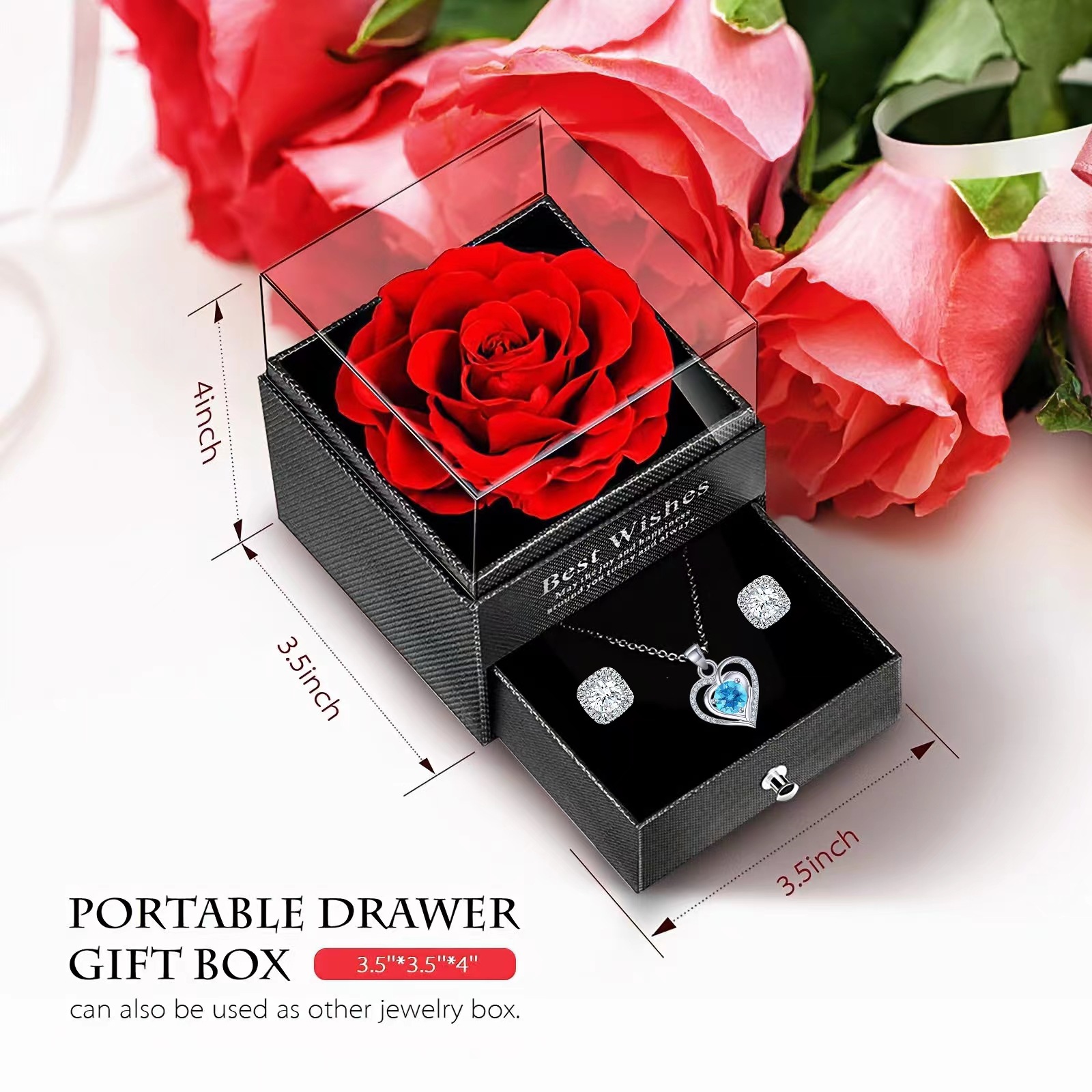 Color: Blue Necklace Square Earrings 1 Rose Gift Box