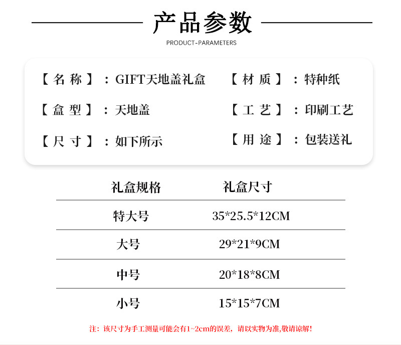 Specifications and models: Heaven and earth cover gift box + gift bag; 29*21*9cm