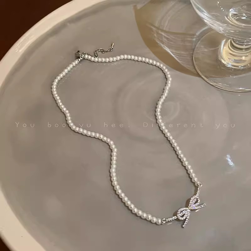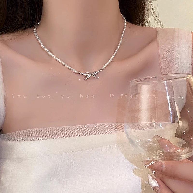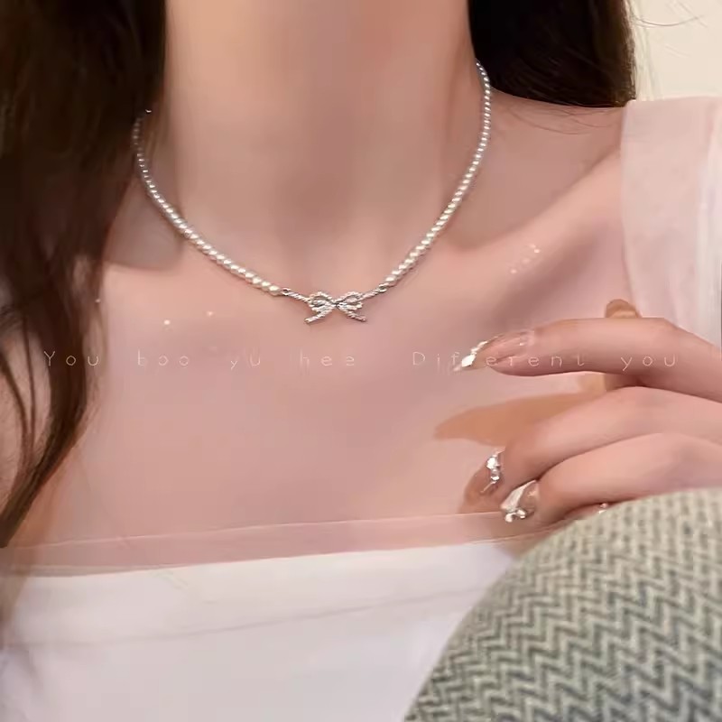 French style millet beads pearl bow necklace women's niche high-end clavicle chain 2024 new temperament accessories