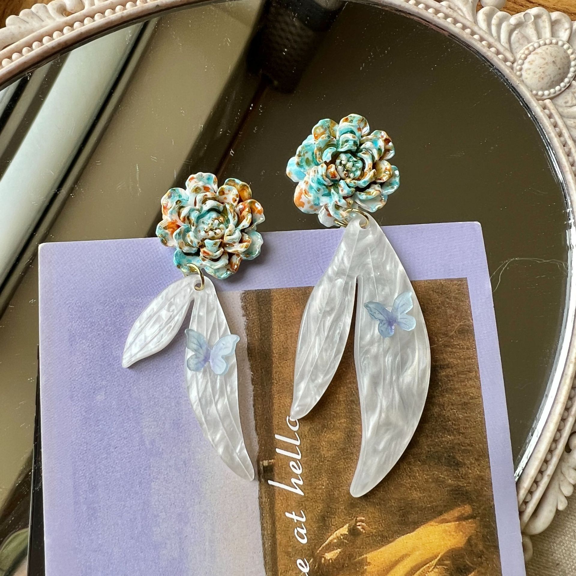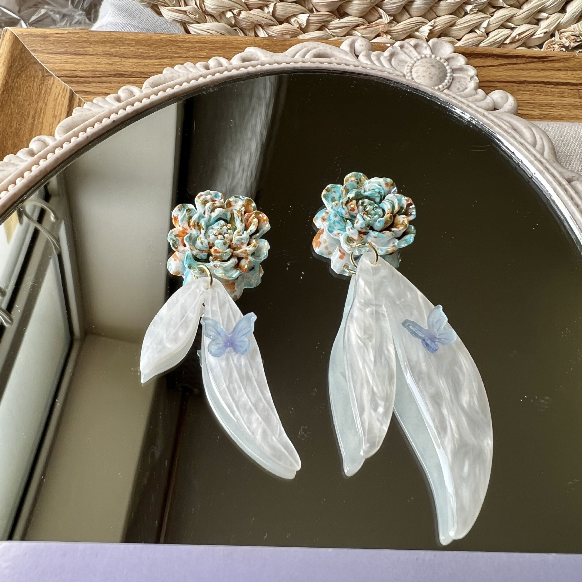Super fairy blue hibiscus flower earrings gradient flower white petals light blue butterfly earrings temperament ear clip earrings