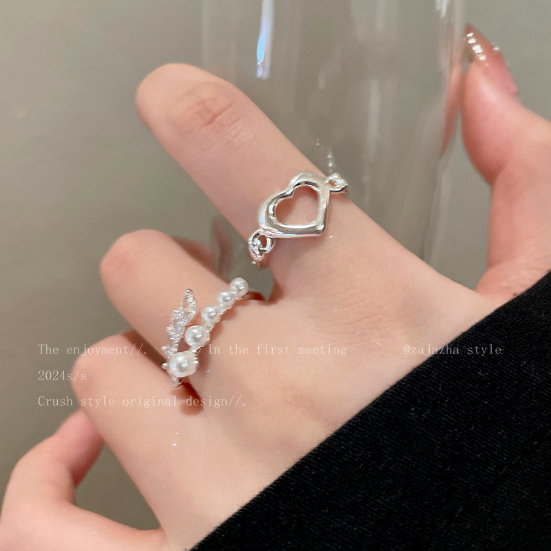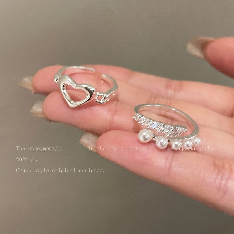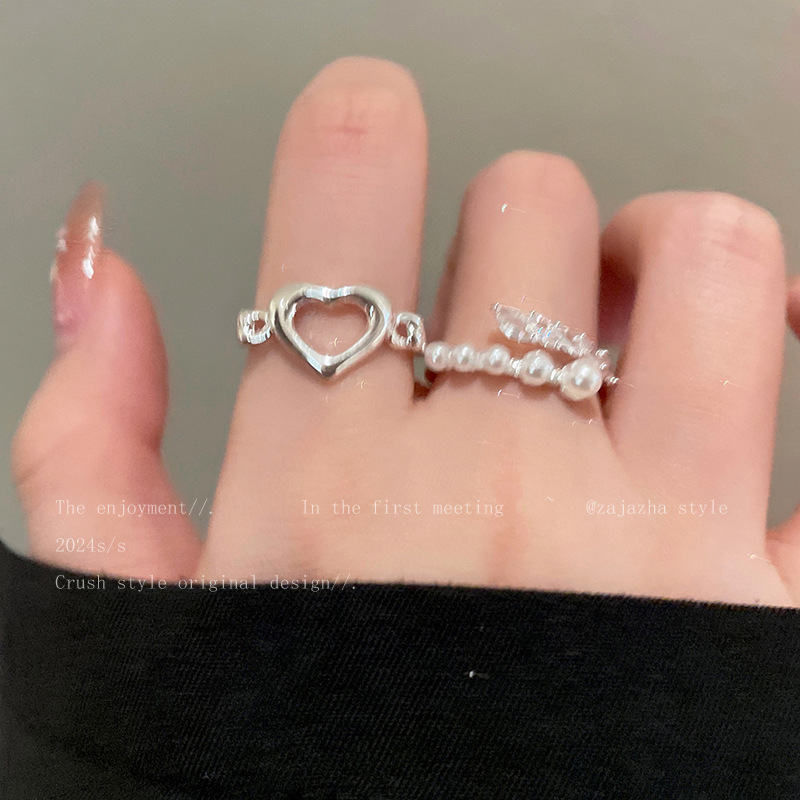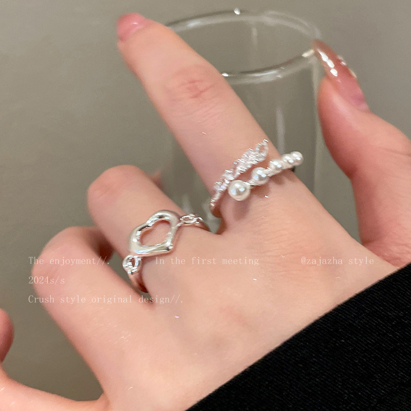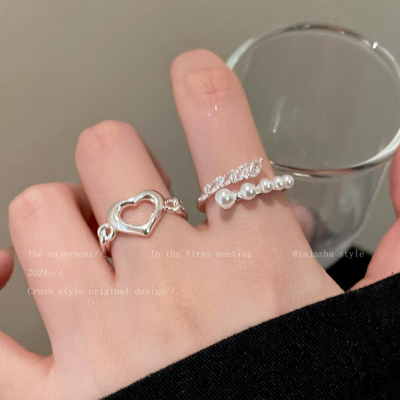 Hollow Pearl Love Ring Two-piece Women's Opening Adjustable Niche Finger Ring Personalized Fashion All-match Ring
