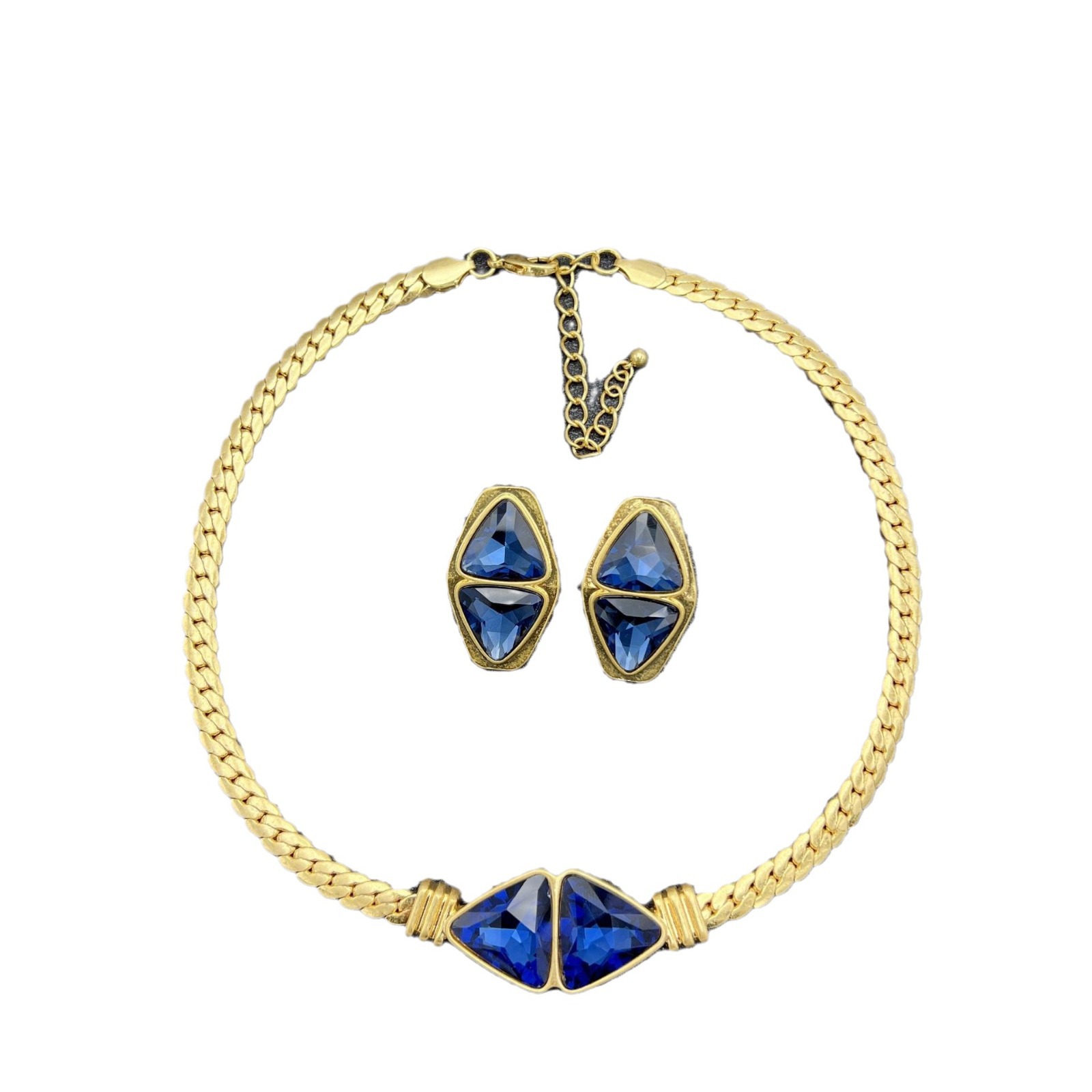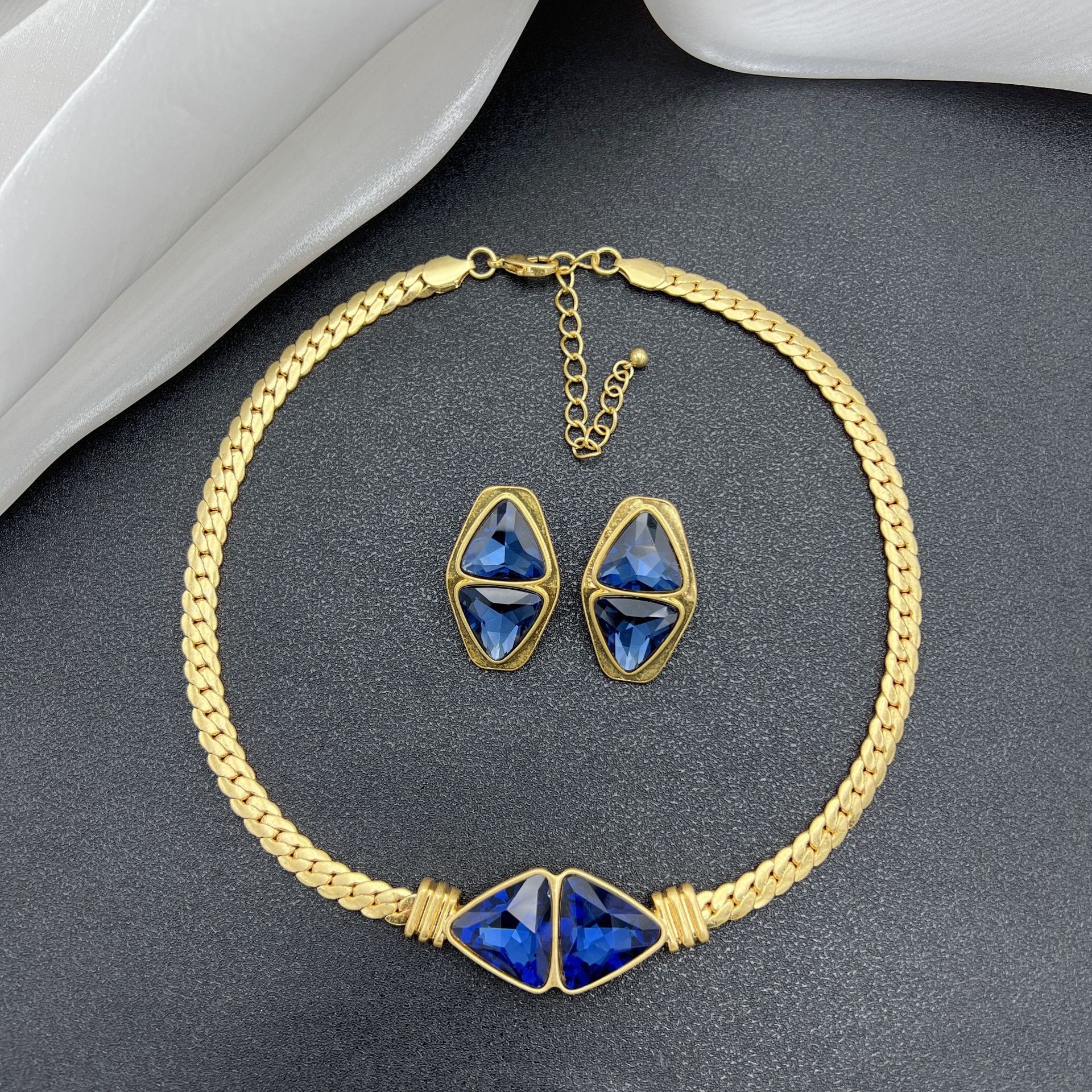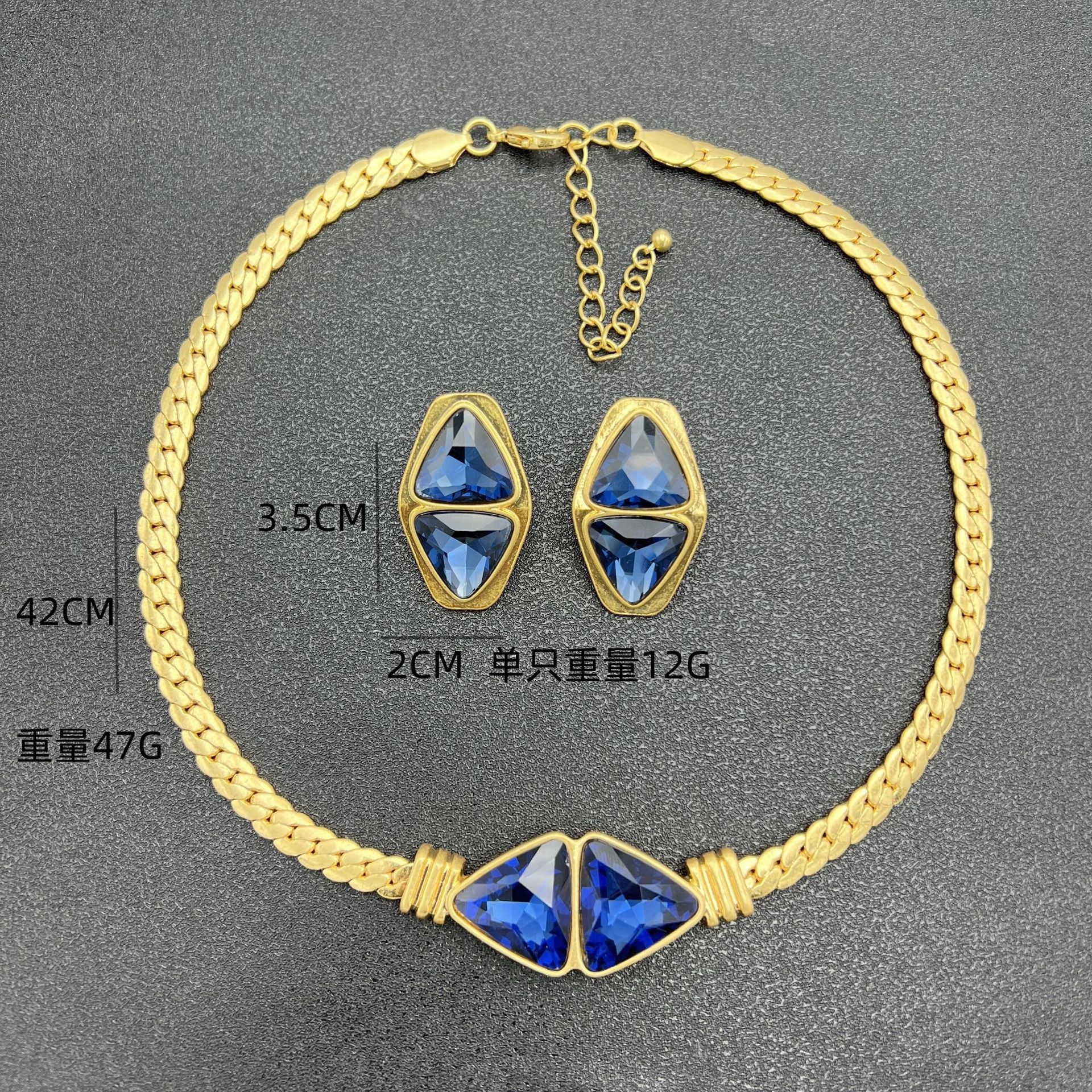 Middle Ancient vintage Real Gold Electroplated Copper Chain Alloy Retro Heavy Industry Blue Glass Women's Necklace Earrings suit