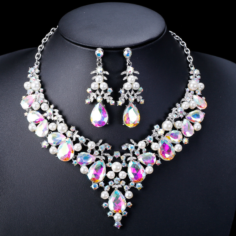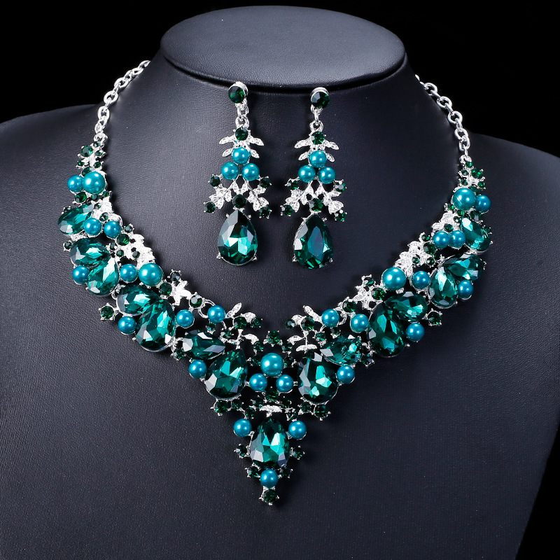 Trendy Retro Colorful Gemstone Teardrop Necklace and Earring Set, Exquisite and Elegant Jewelry, Collarbone Necklace, Ethnic Style
