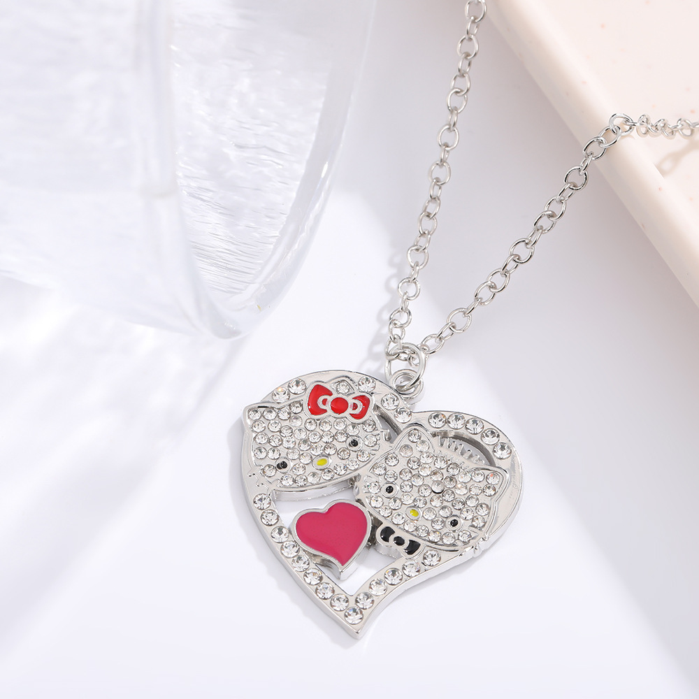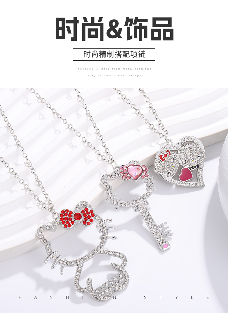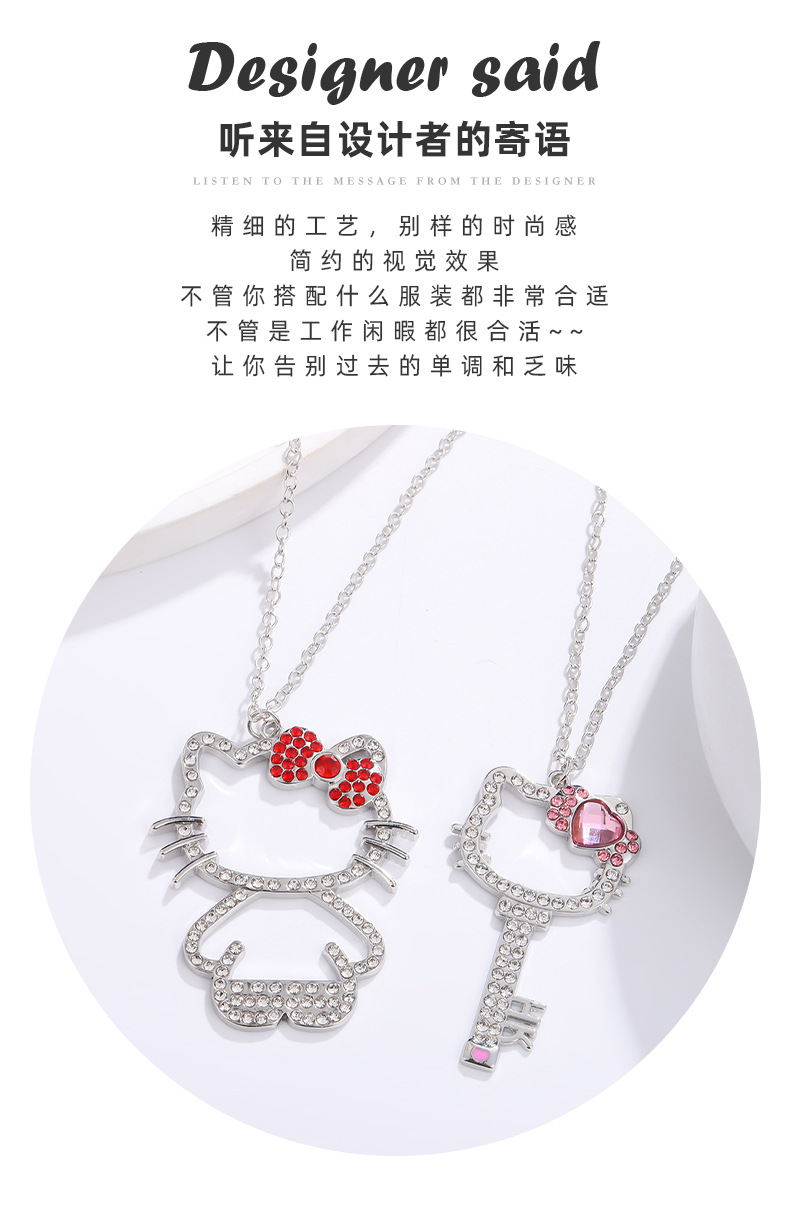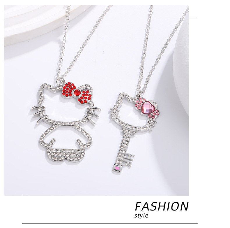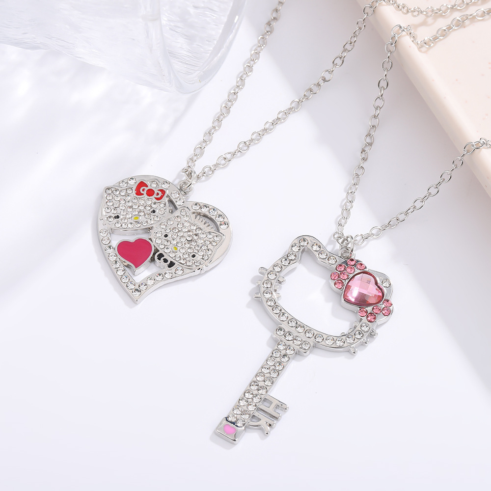 Japanese Cute Love KT Cat Necklace Creative Key Hello Kitty Full Diamond Pendant Cartoon Cat Alloy Necklace for Women