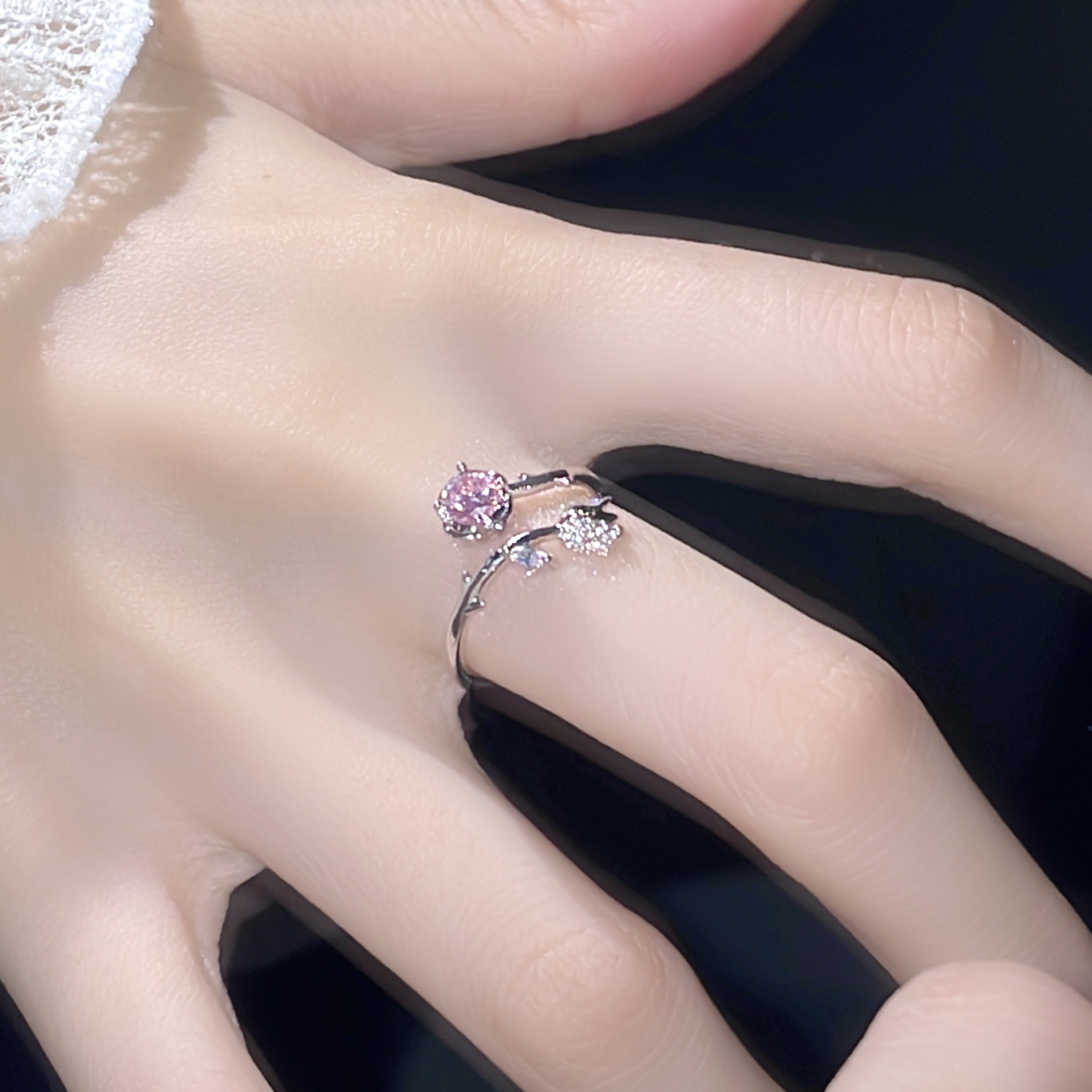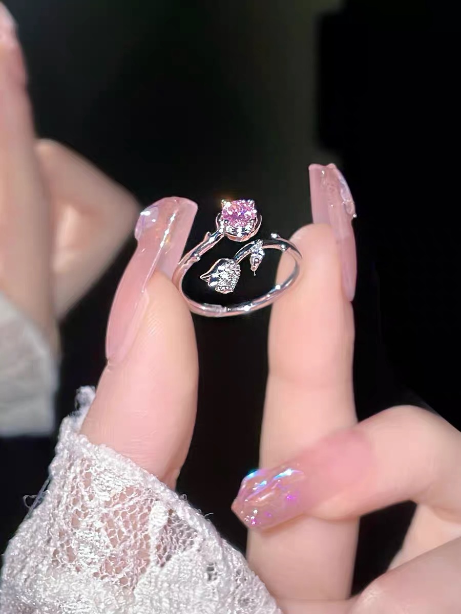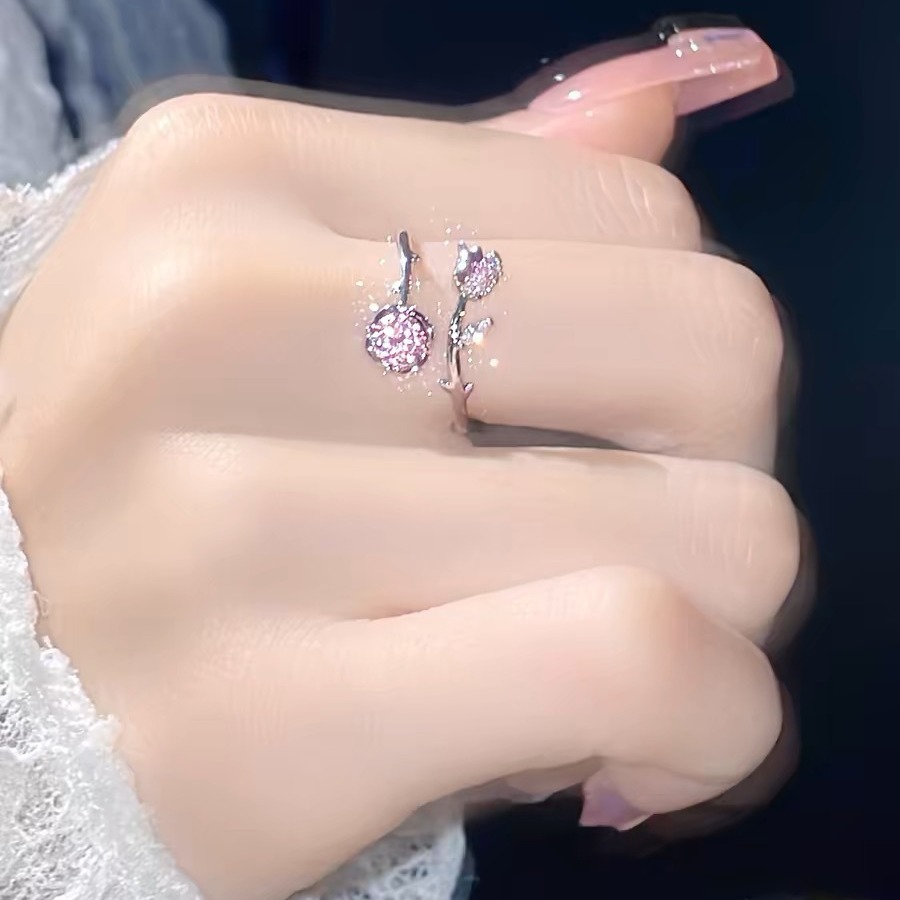 New Pink Zirconium Rose Ring Women's Mori Style Light Luxury All-match Bracelet Super Fairy Girl Flower Opening Adjusting Ring
