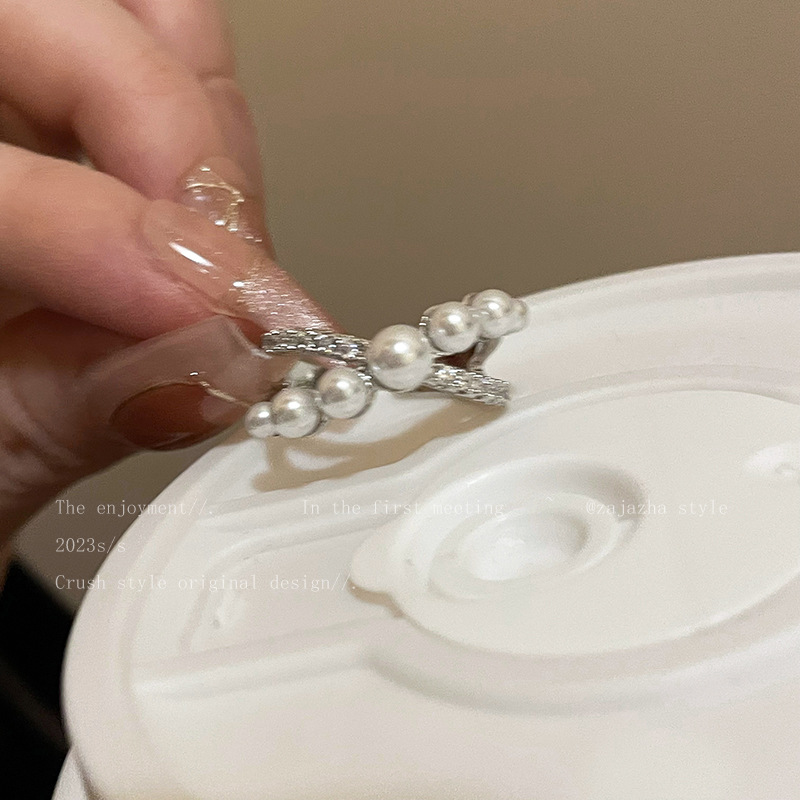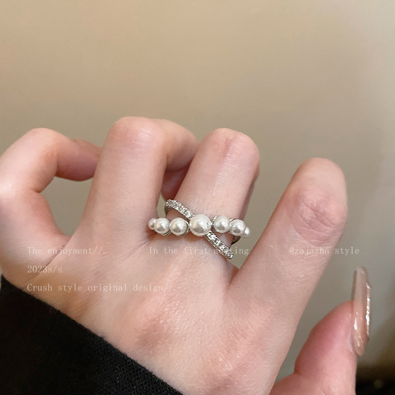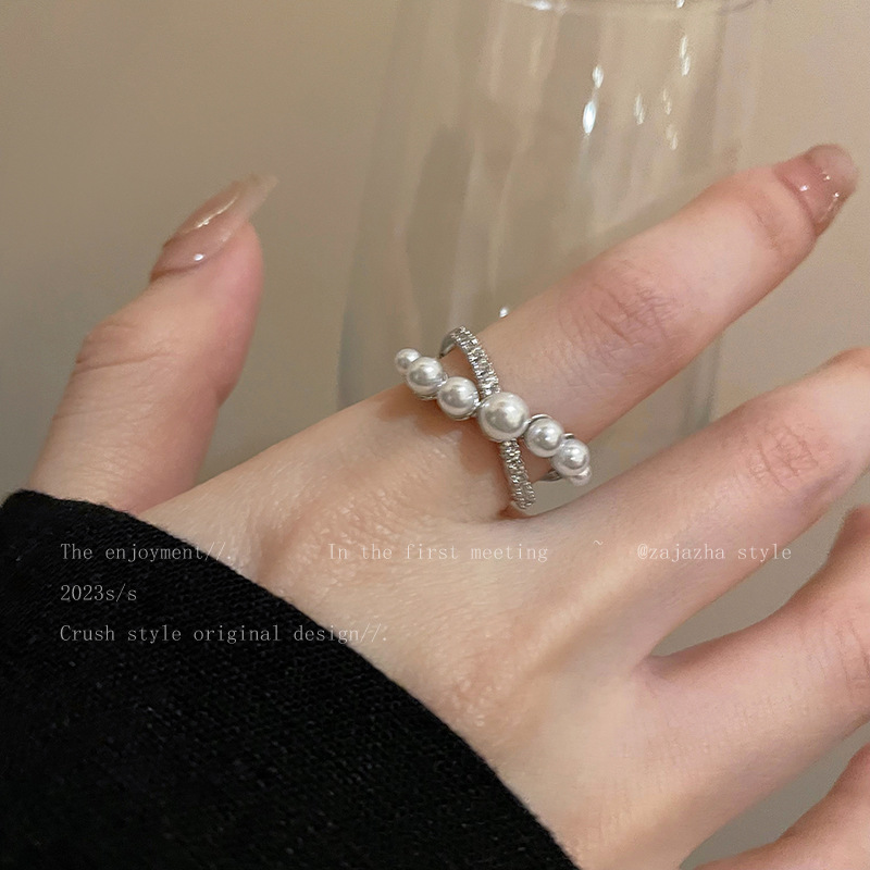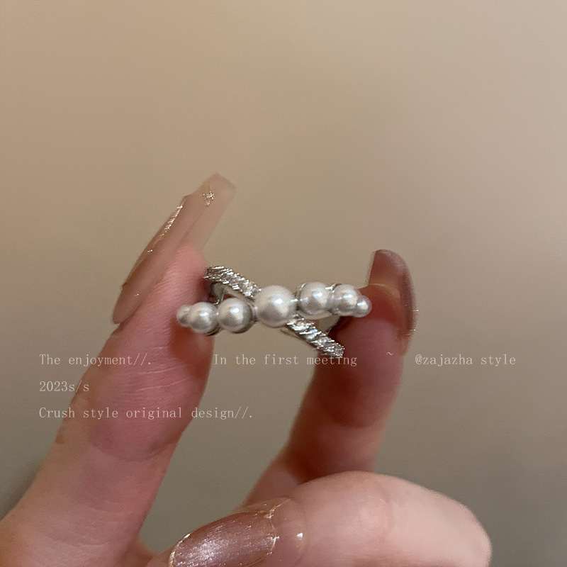 法式珍珠交叉设计戒指女时尚个性食指戒小众轻奢高级感开口指环潮