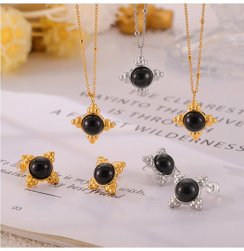 French Style Simple Daily Black Onyx Pendant Women's Antique New Product Titanium Steel Gold-plated Necklace Niche Design Jewelry suit