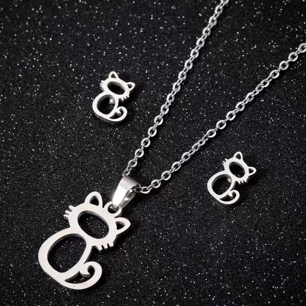 Fashion stainless steel hollow small animal pendant clavicle chain girl's personality cute hollow cat earrings three-piece set