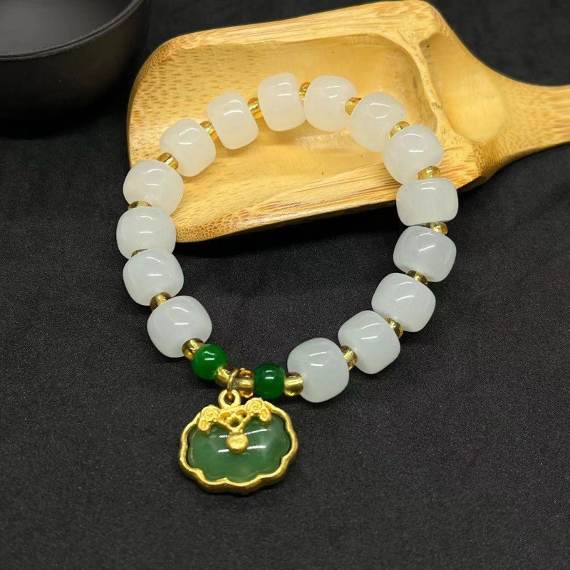 Color: S073-white jade green bead bracelet green longevity lock#Sz 568