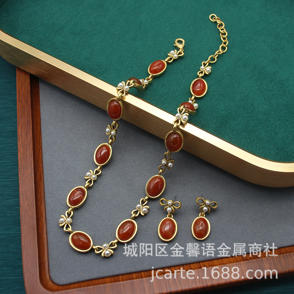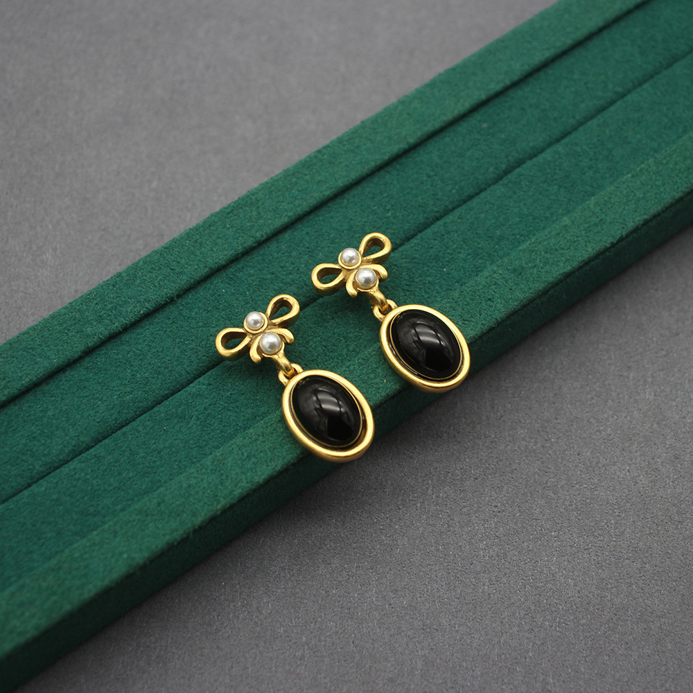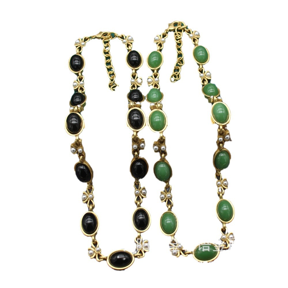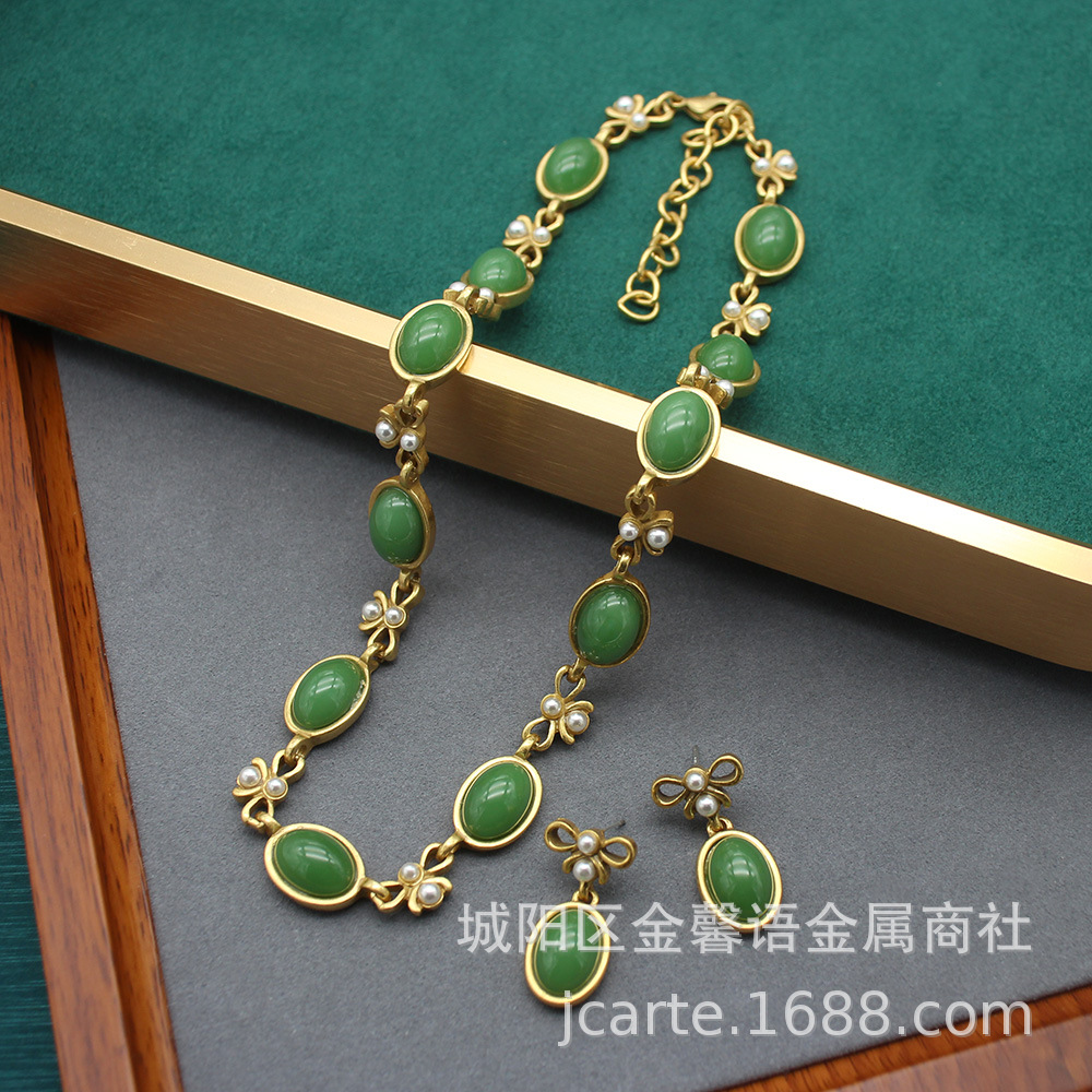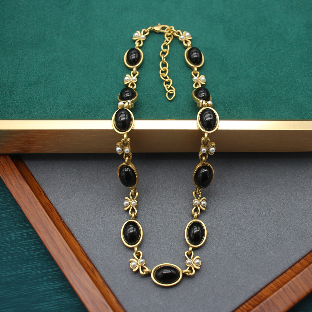 Necklace High-grade Accessories Vintage Old Oval Black Glass Necklace Ear suit Simple Bow Collarbone