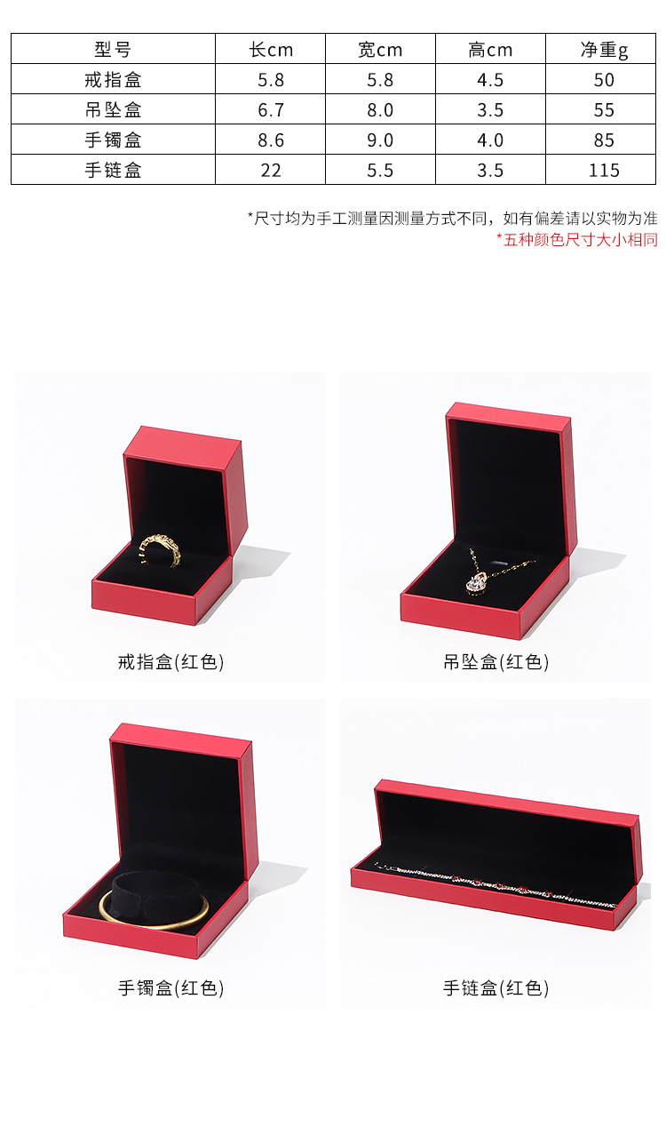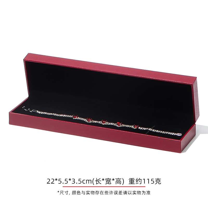 Specifications and models: Red weicai bracelet box [22*5.5*3.3cm]; leather-filled paper jewelry box