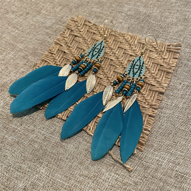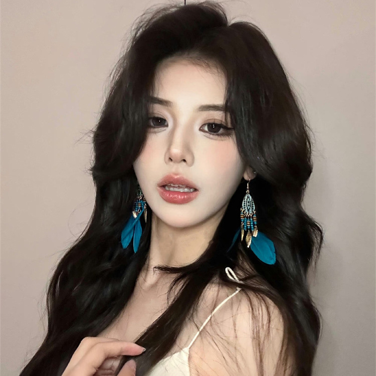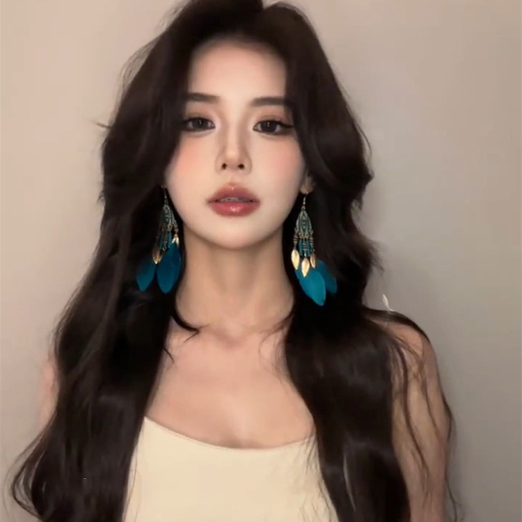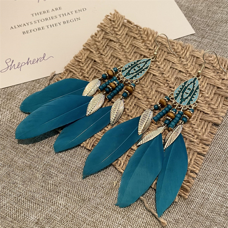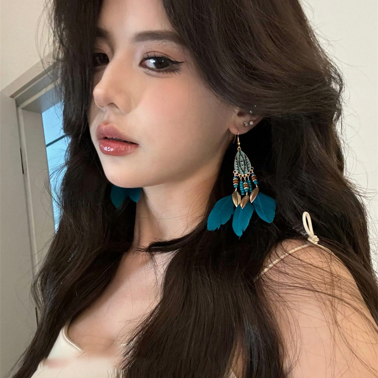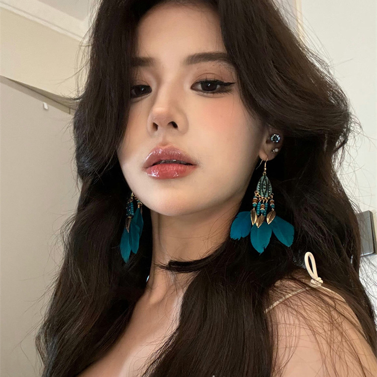 New Chinese Niche Design Sense Advanced Ethnic Style Earrings Women's Retro Elegant Long Blue Feather Tassel Earrings