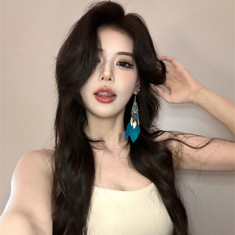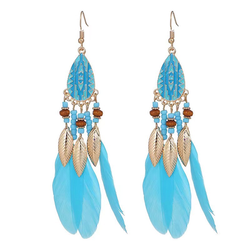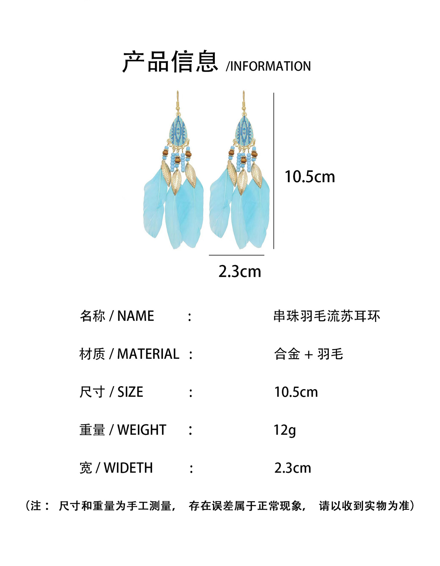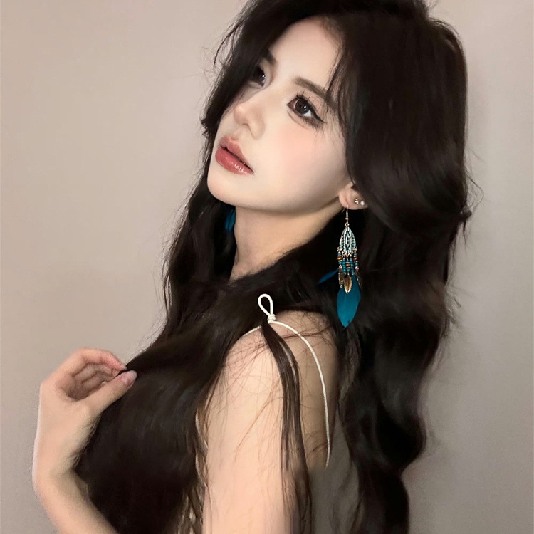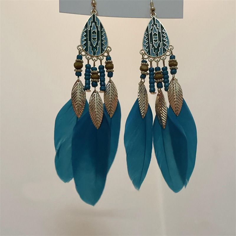 New Chinese Niche Design Sense Advanced Ethnic Style Earrings Women's Retro Elegant Long Blue Feather Tassel Earrings