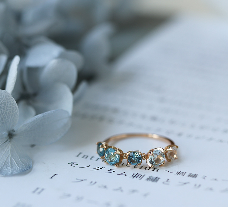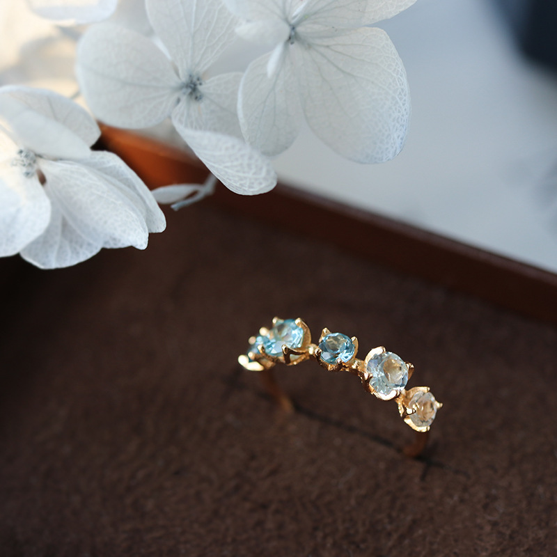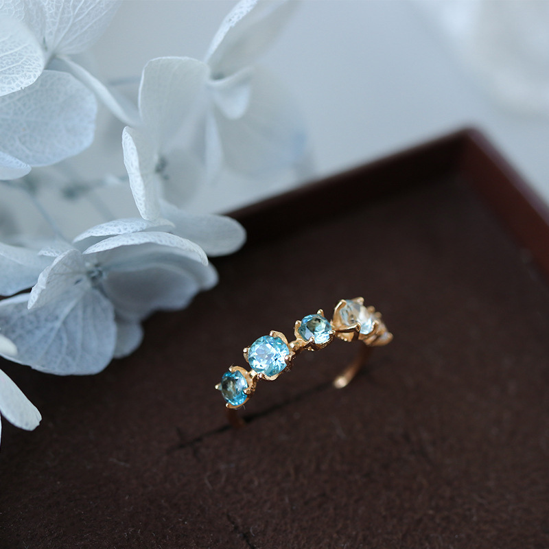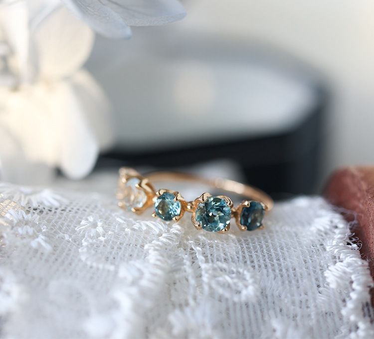New Gradient Blue and White Topaz Multi Gem Zircon Ring Women's Japanese Style Same Style Gold Plated Light Luxury Open Ring