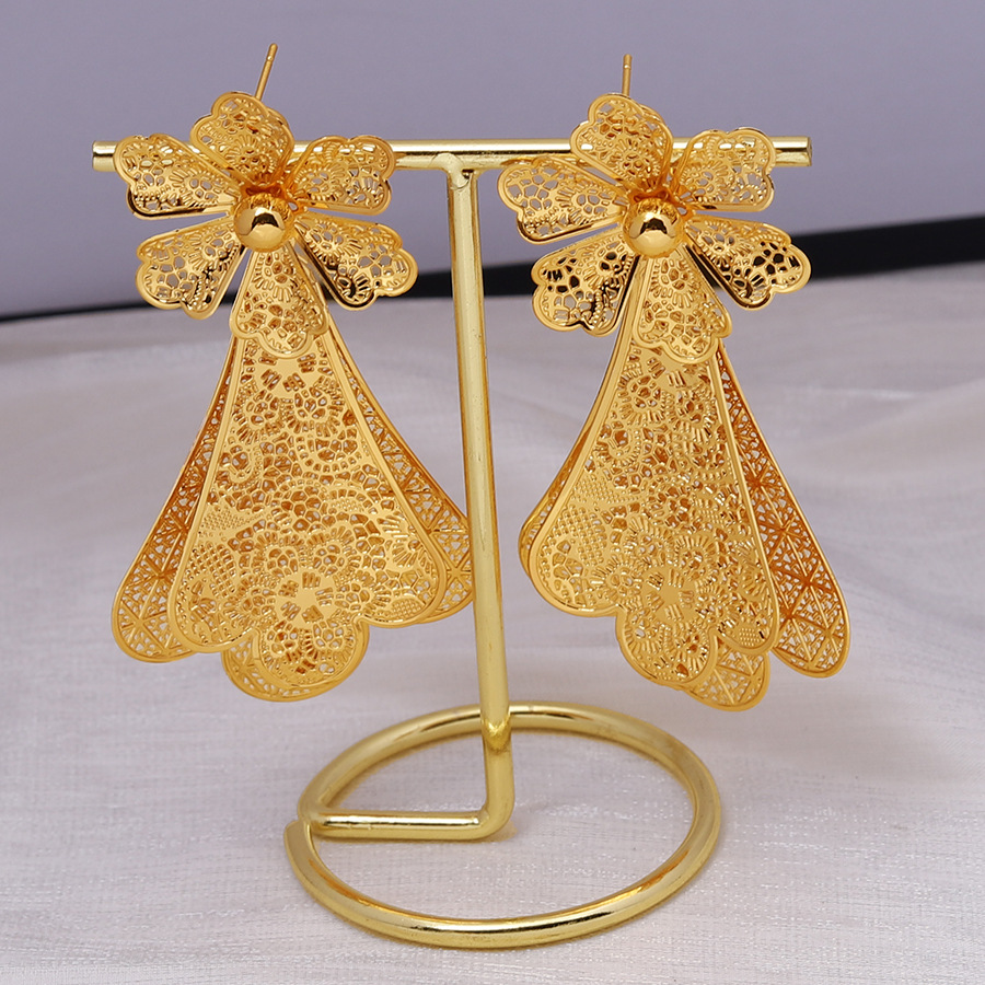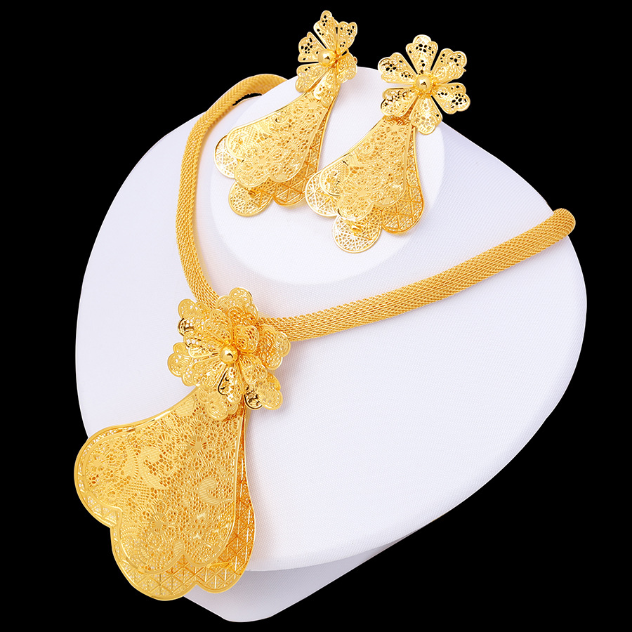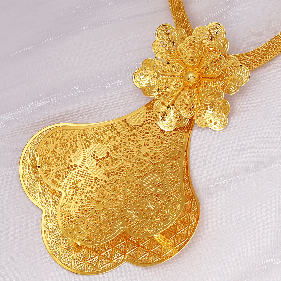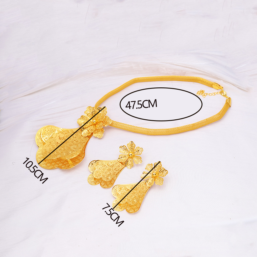 Middle East Cross Border Set for Women 24K Yellow Gold Color Big Flower Pendant NecKlace and Earrings Dubai Wedding Party Jewelry