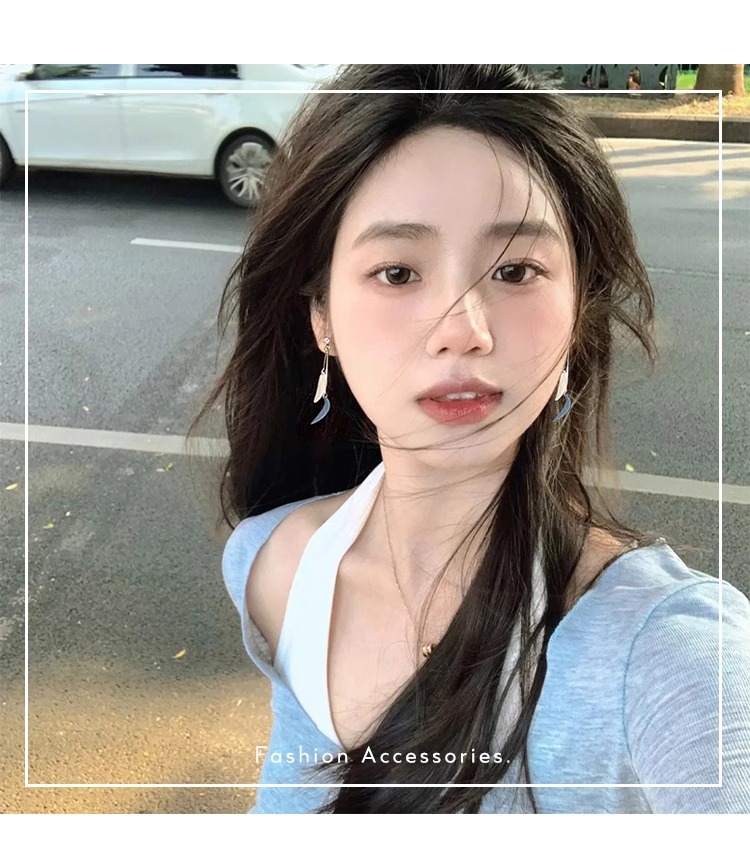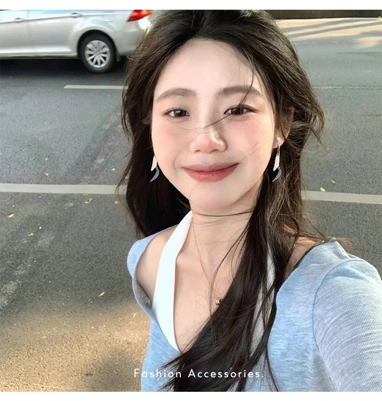 Blue Long Slim Leaf Ear Stud Mosquito Incense Plate Ear Clip Without Ear Holes Female Niche Unique Design High-grade Earrings