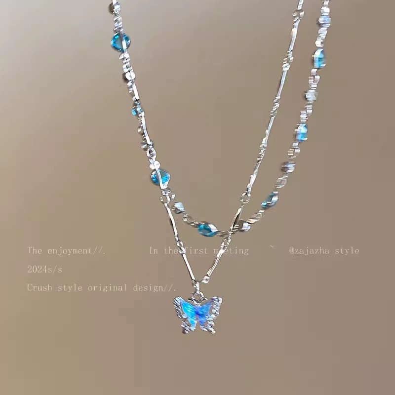 Summer Style Blue Butterfly Necklace Girl's Cool High-Level Design Clavicle Chain Double-Layer Niche Choker