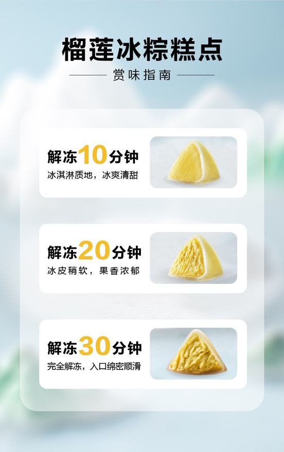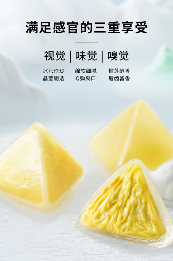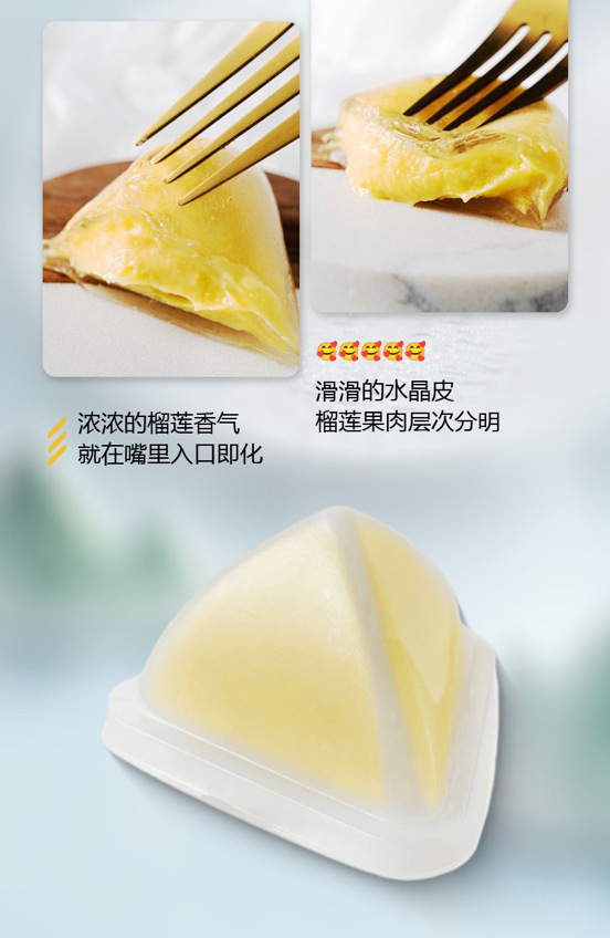 Raw materials and ingredients: Durian pulp, pastry premix powder (hydroxypropyl distarch phosphate, trehalose, edible salt, citric acid), maltose syrup, drinking water, edible vegetable oil