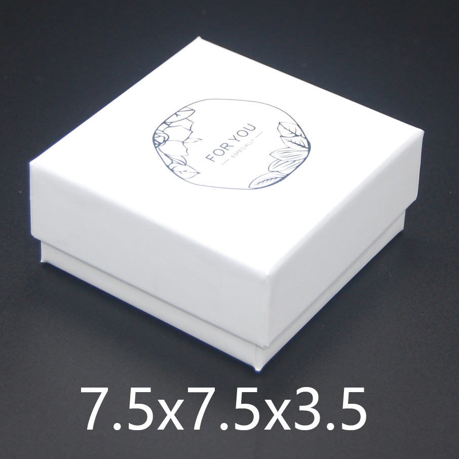 这款盒子属于一款:戒指/吊坠/耳钉/手镯套装型首饰盒,尺寸为:7.5x7.5x3.5cm(外径),盒子材料是用700g纸板+特种充皮纸/珠光纸生产而成,盒内是由1.5cm中密度的黑色海绵贴黑色绒布,海绵上开有可放戒指/吊坠/耳钉的孔槽,方便各人所需要而选择.