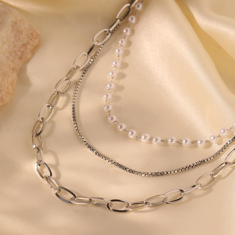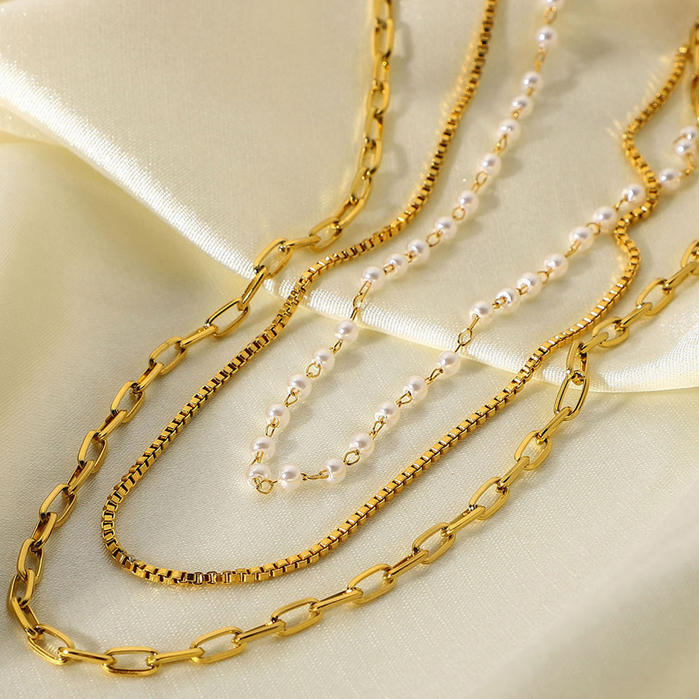 Europe and the United States INS net red with necklace independent packaging 18K gold stainless steel small pearl chain three-layer necklace women's