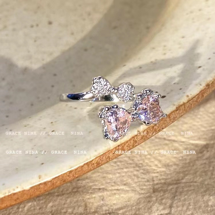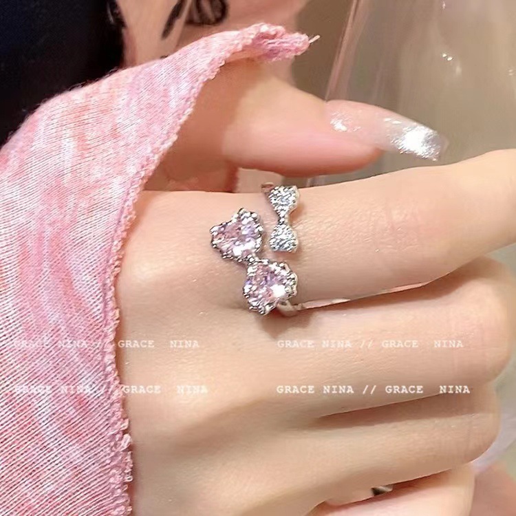 Sweet dizzy! Pink Diamond Bow Ring Women's Light Luxury Elegant Finger Ring Niche Design High Sense Fashion Ring