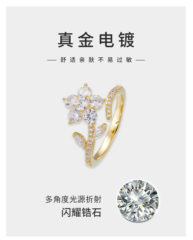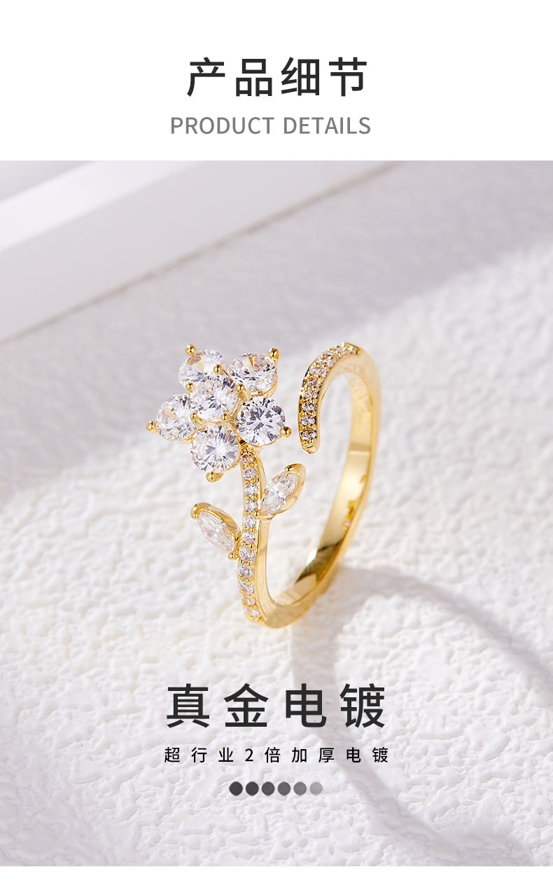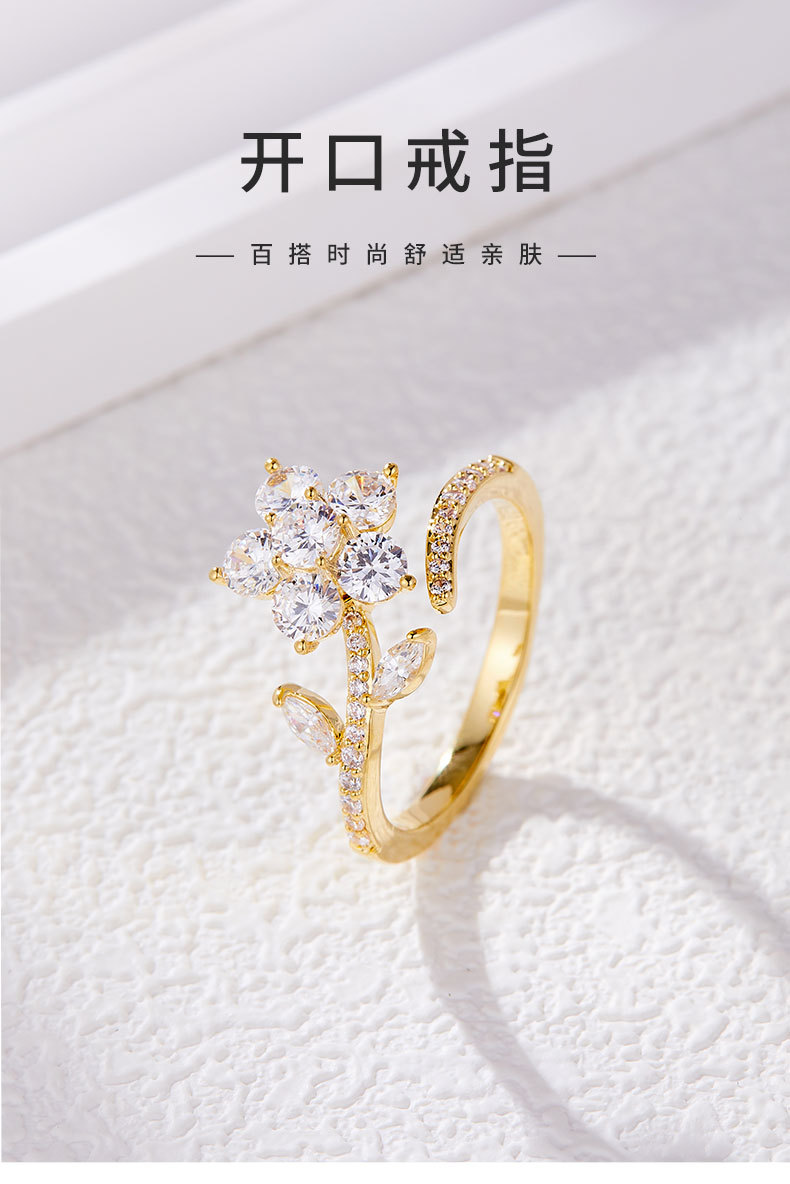 高级感双花朵开口戒指小众轻奢精致食指戒真金电镀爆款可调节戒圈